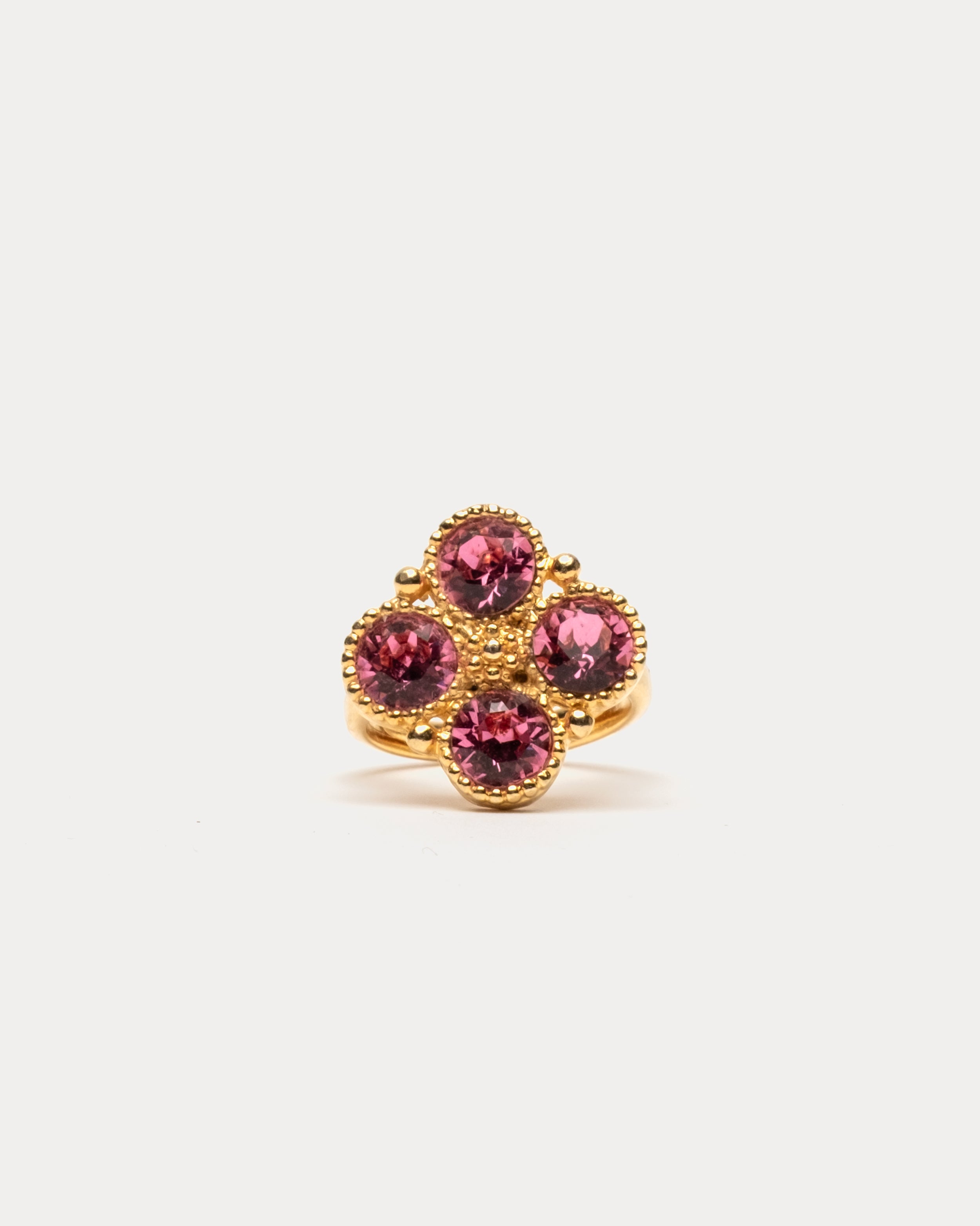This four-faceted pink stone ring shines with soft color and sculptural sparkle. Set to catch the light from every angle, it’s an effortless statement piece that adds a fresh pop to any look. Sweet, striking, and endlessly wearable.