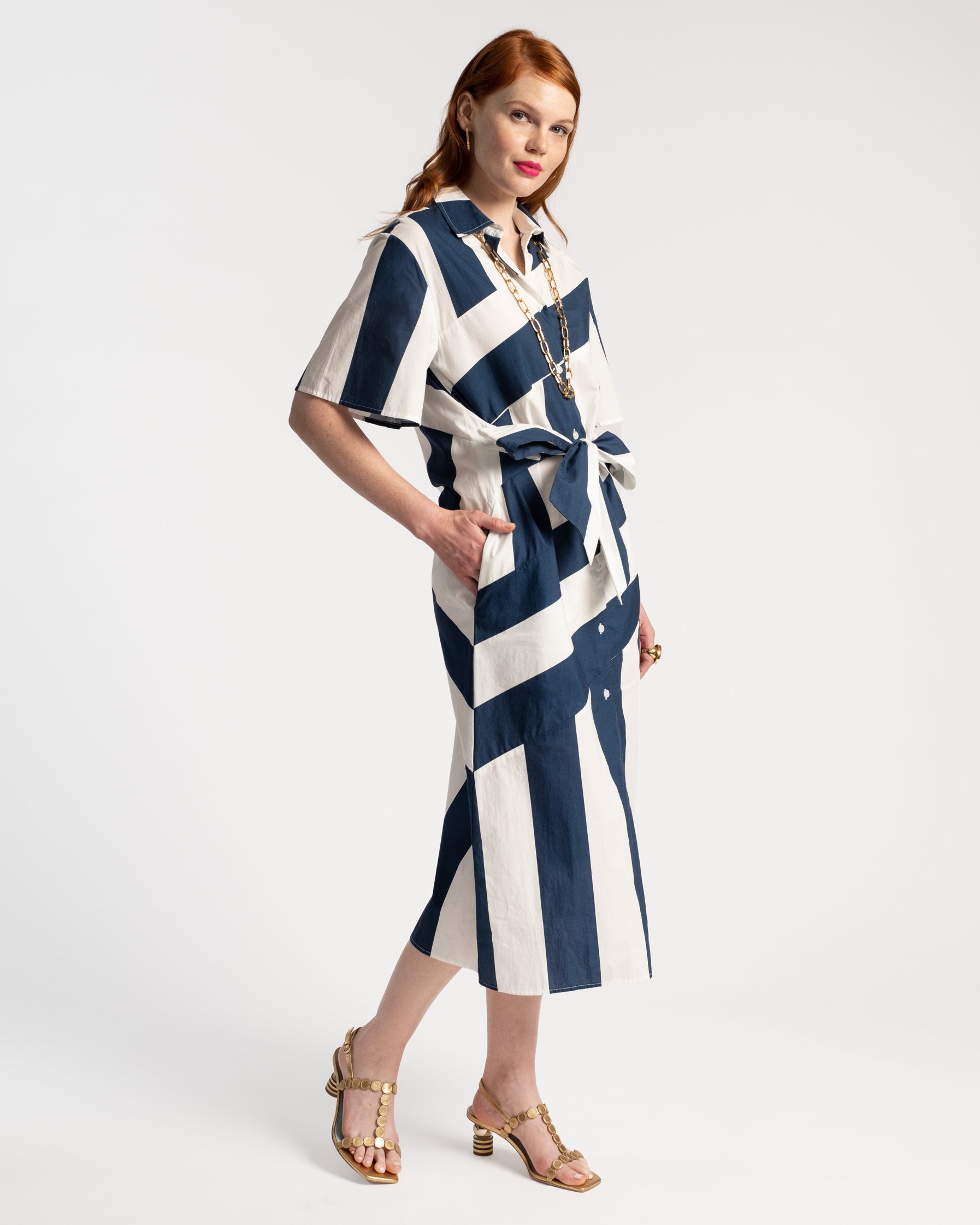 Tailor-made. Amanda is a timeless women's shirt dress design with a twist – uniquely shaped with wide short sleeves, a fitted waist and flared bottom skirt. Detailed with front-buttons and bold print patterns, this midi dress is perfect for styling clean-cut, warm weather looks.