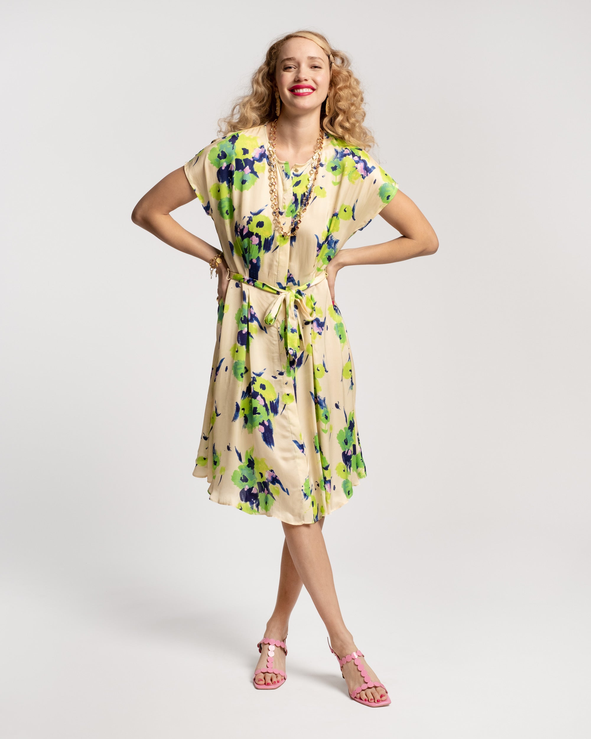 Style as smooth as silk. Our Anna Slope Arm Dress is a luxurious, lightweight dress with a belted waist and front button details. Featuring a V-neck and short-sleeves, this midi-length piece offers a feminine feel for flowy summer looks or elegant evening affairs.†