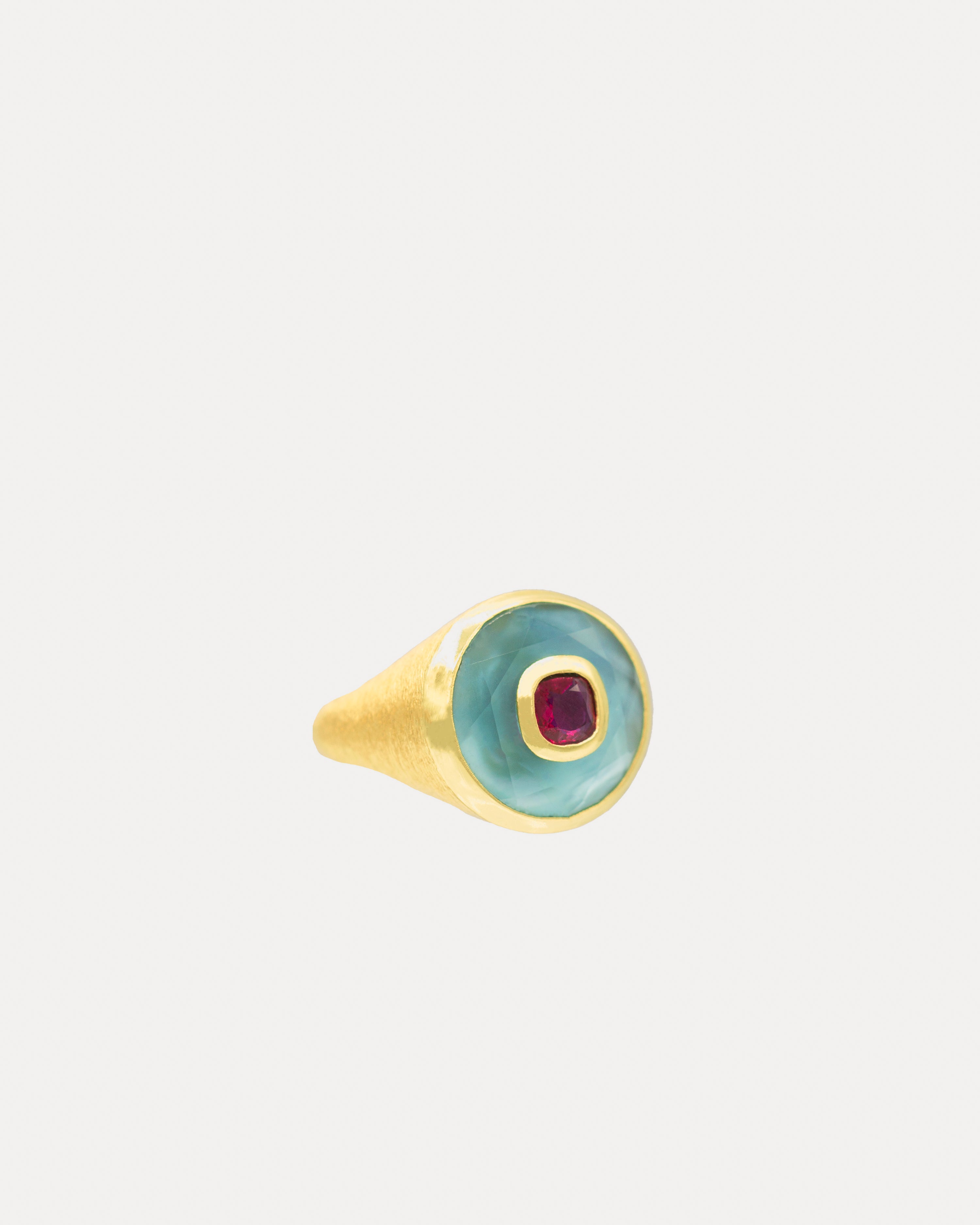 18k gold plated brush ring with sapphire and fuschia stone in the center. Handmade in Brazil.