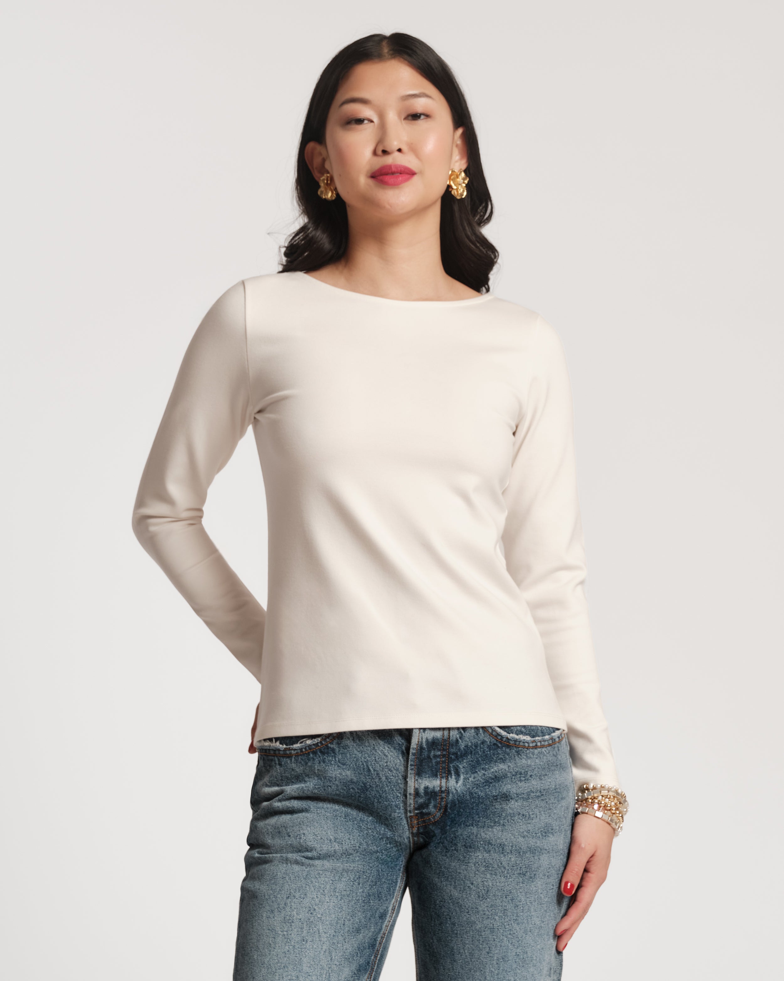 A not-so-basic basic. This fitted long sleeve tee is made from the same softly structured, stretchy rayon blend as our best-selling Whitney Wrap. Lightweight yet substantial, it hugs just right and layers like a dream. A true year-round staple you'll keep in constant rotation.