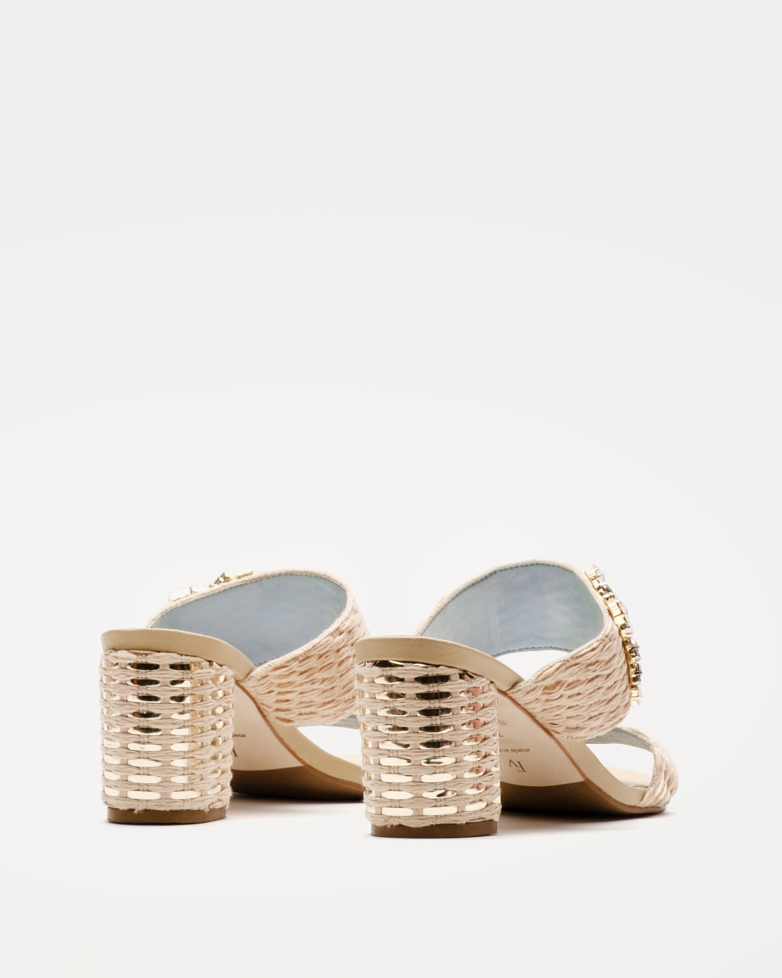 The Betty Heel blends vintage charm with everyday ease. A woven raffia-wrapped block heel grounds the look, while an oversized buckle adds a subtle point of interest. Designed to pair seamlessly with everything from crisp white linen dresses to everyday denim, Betty is that just-right shoe you reach for without thinking. Finished with delicate metallic threads, it brings a soft lift to any look for a polished, unfussy, and endlessly wearable silhouette.
