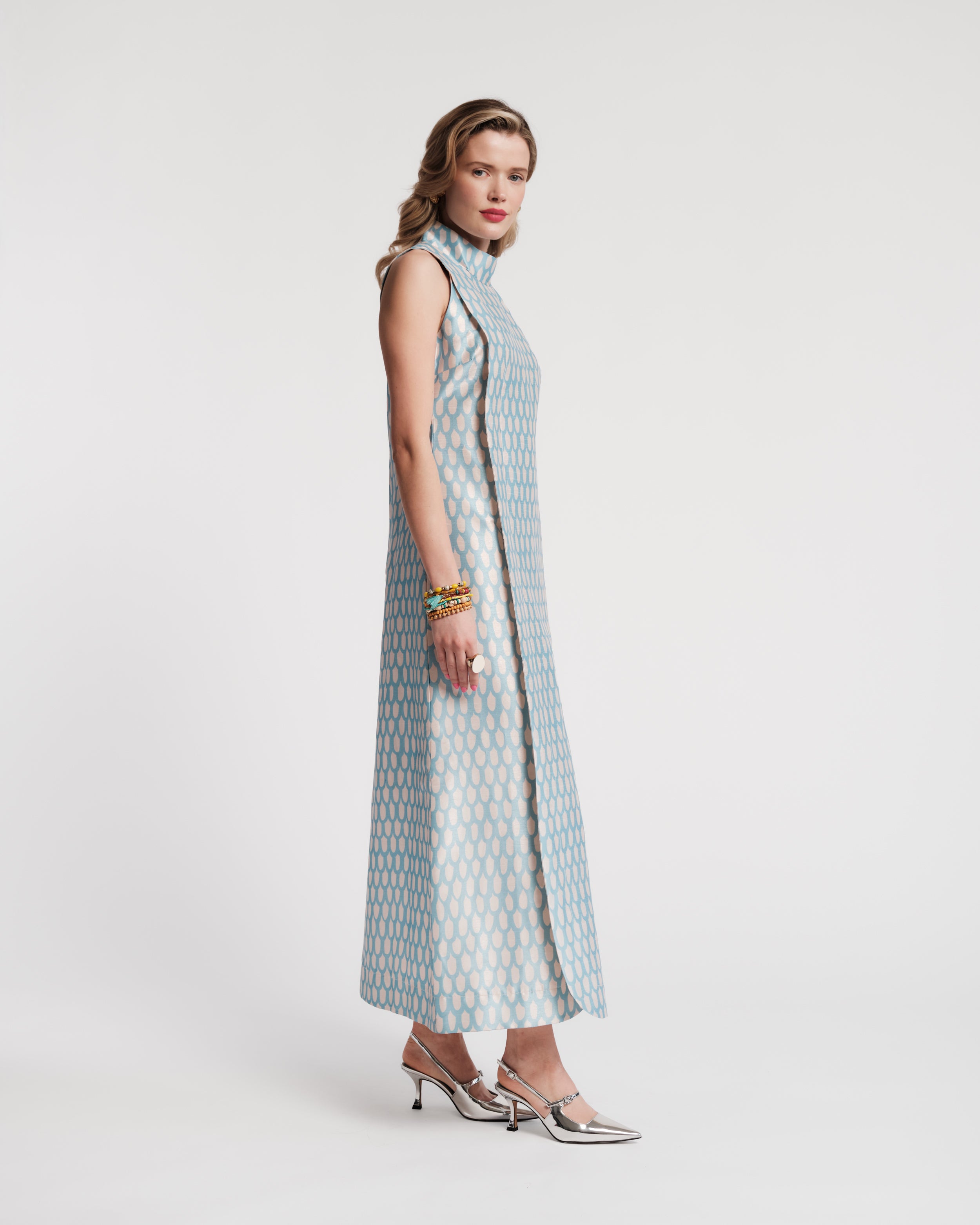 Step into the spotlight with the Carlyle, your go-to dress for unforgettable moments. A statement-making fusion of modern style and vintage charm, this full-length, sleeveless dress has a unique column silhouette with a layered construction, a mock neck, and pockets.