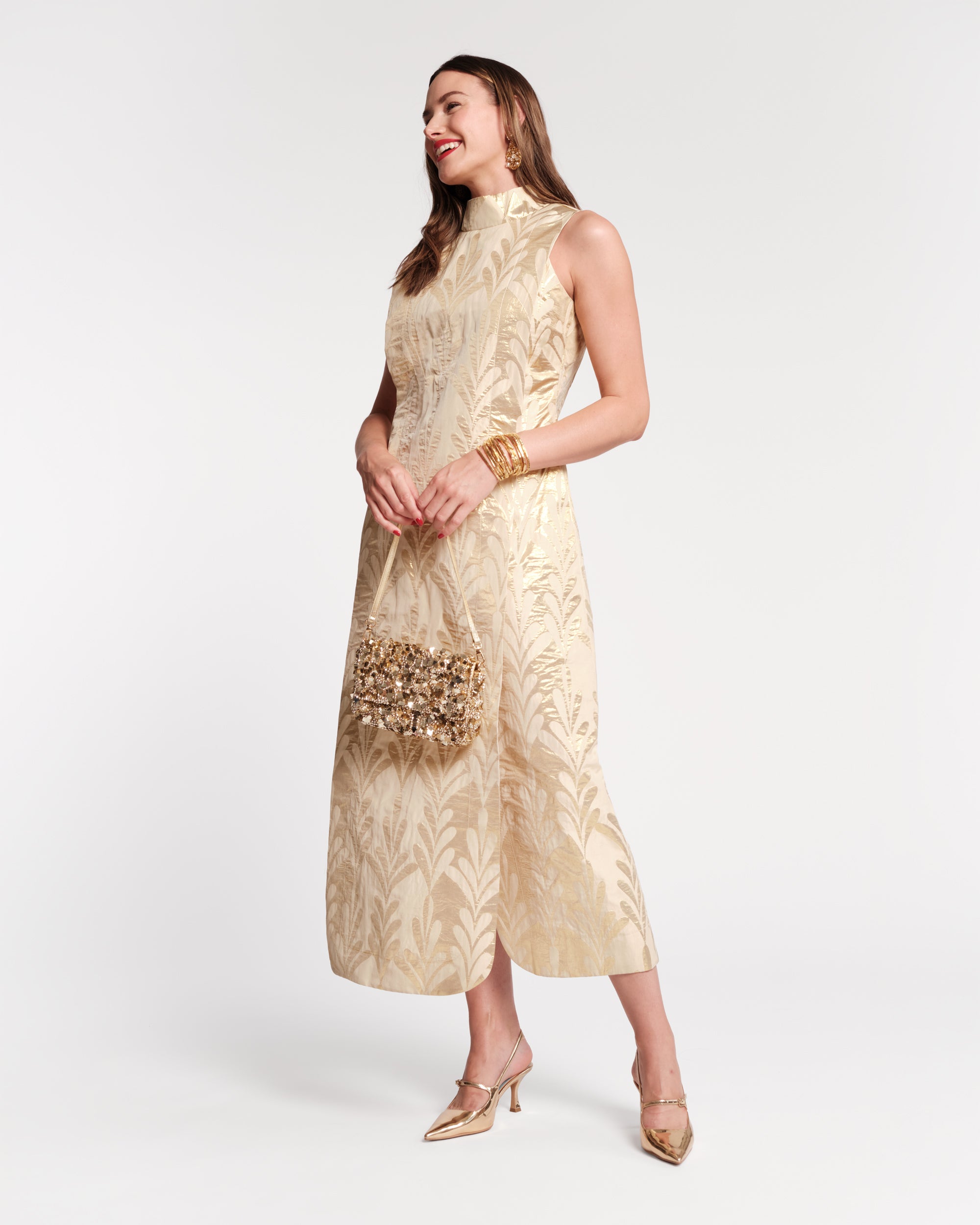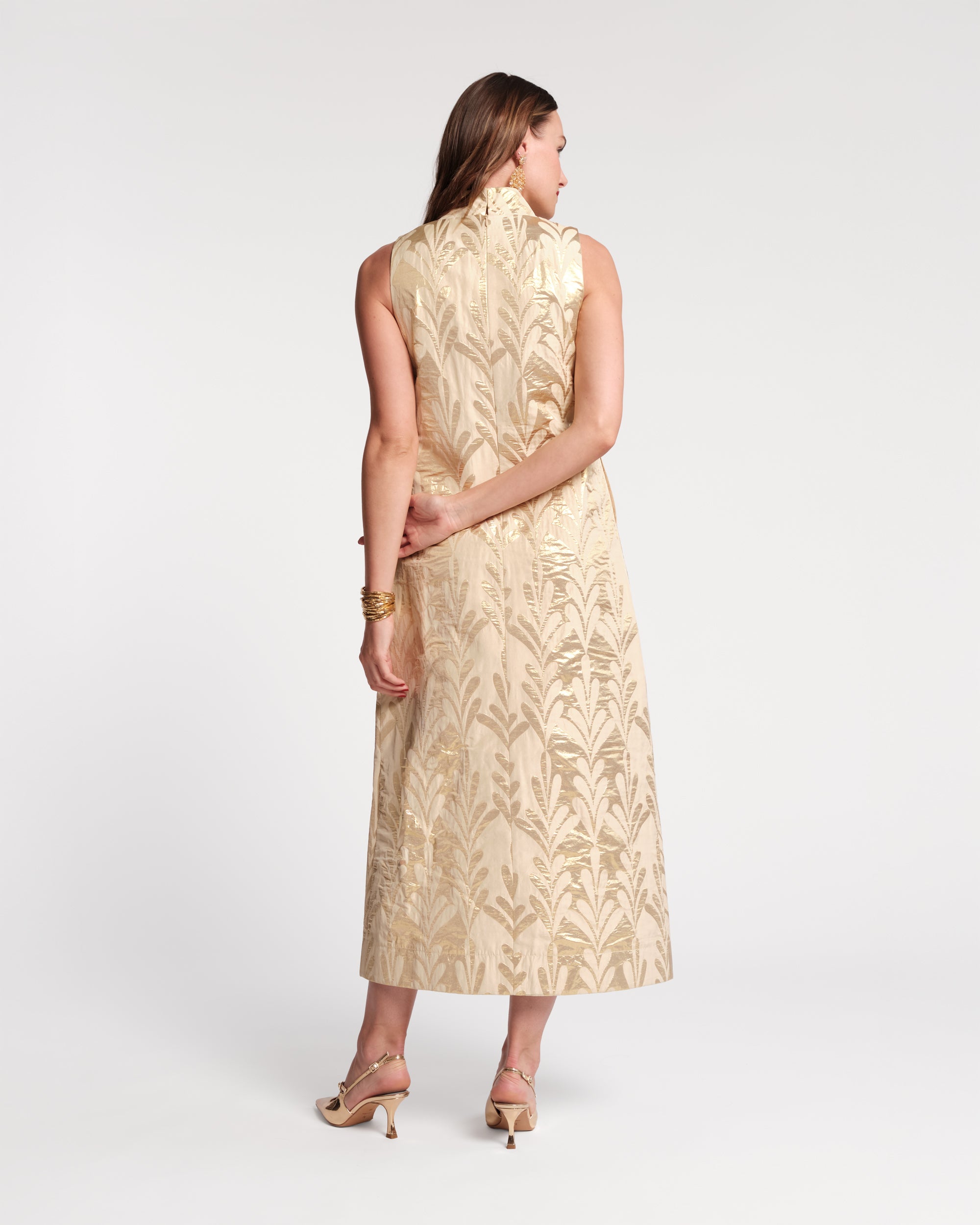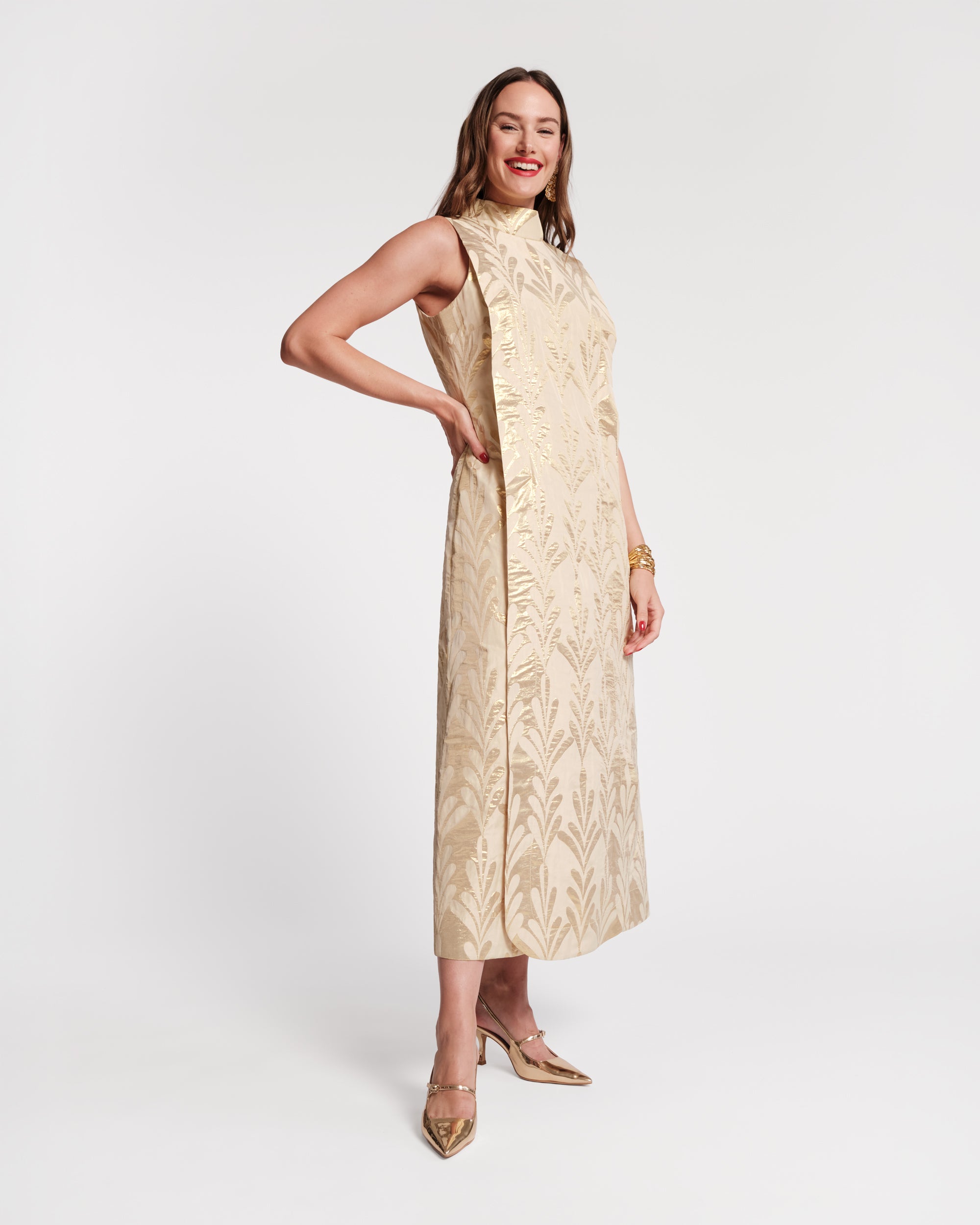 Step into the spotlight with the Carlyle, your go-to dress for unforgettable moments. A statement-making fusion of modern style and vintage charm, this full-length, sleeveless dress has a unique column silhouette with a layered construction, a mock neck, and pockets.