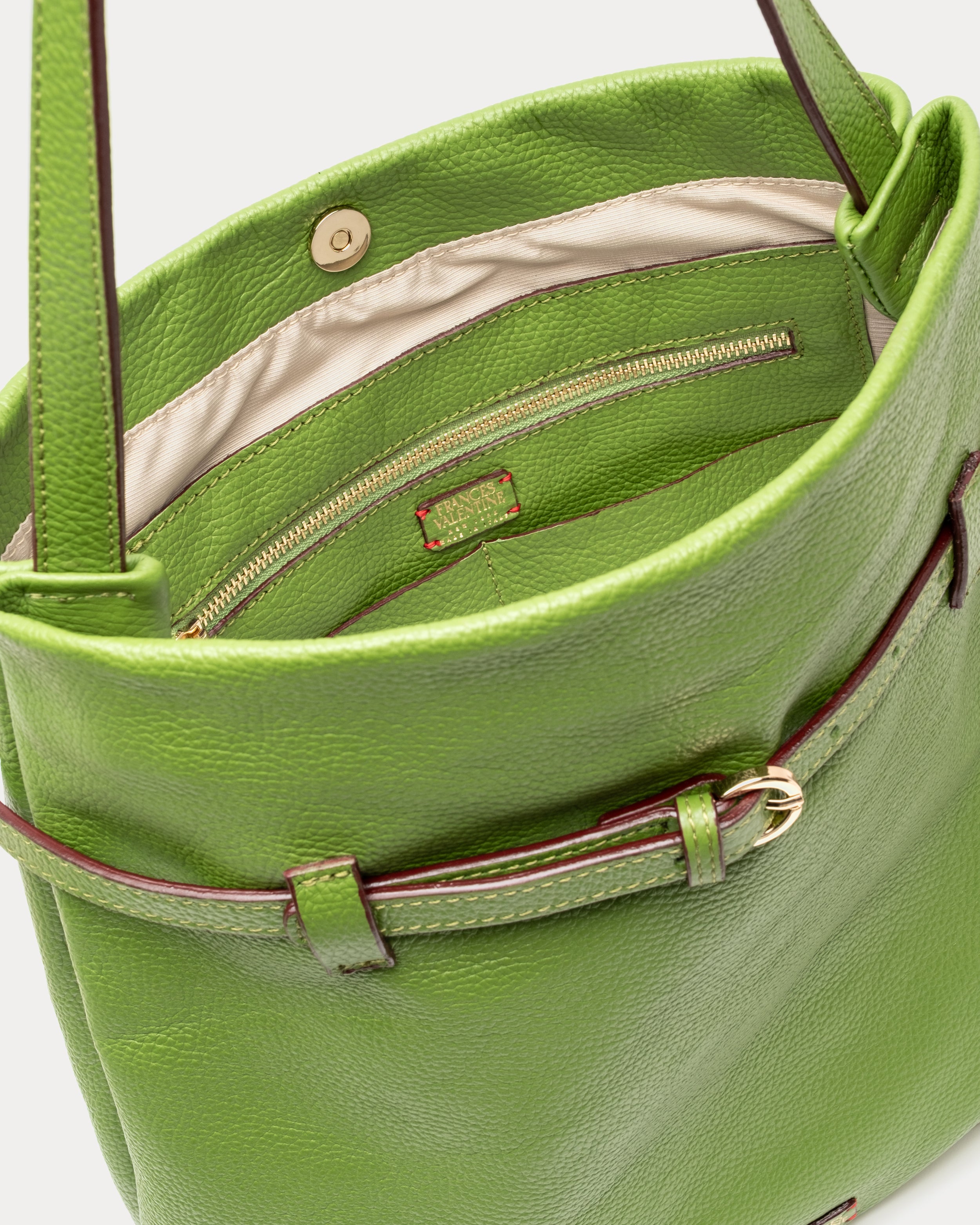Meet the Charlie Shoulder Bag, a spacious, softly structured bucket tote crafted from supple Italian tumbled leather. Its clean silhouette is elevated with a refined front buckle and and shoulder strap for effortless, comfortable wear. Inside, a roomy interior with a zip pocket keeps all your essentials organized, while the magnetic closure ensures easy access.