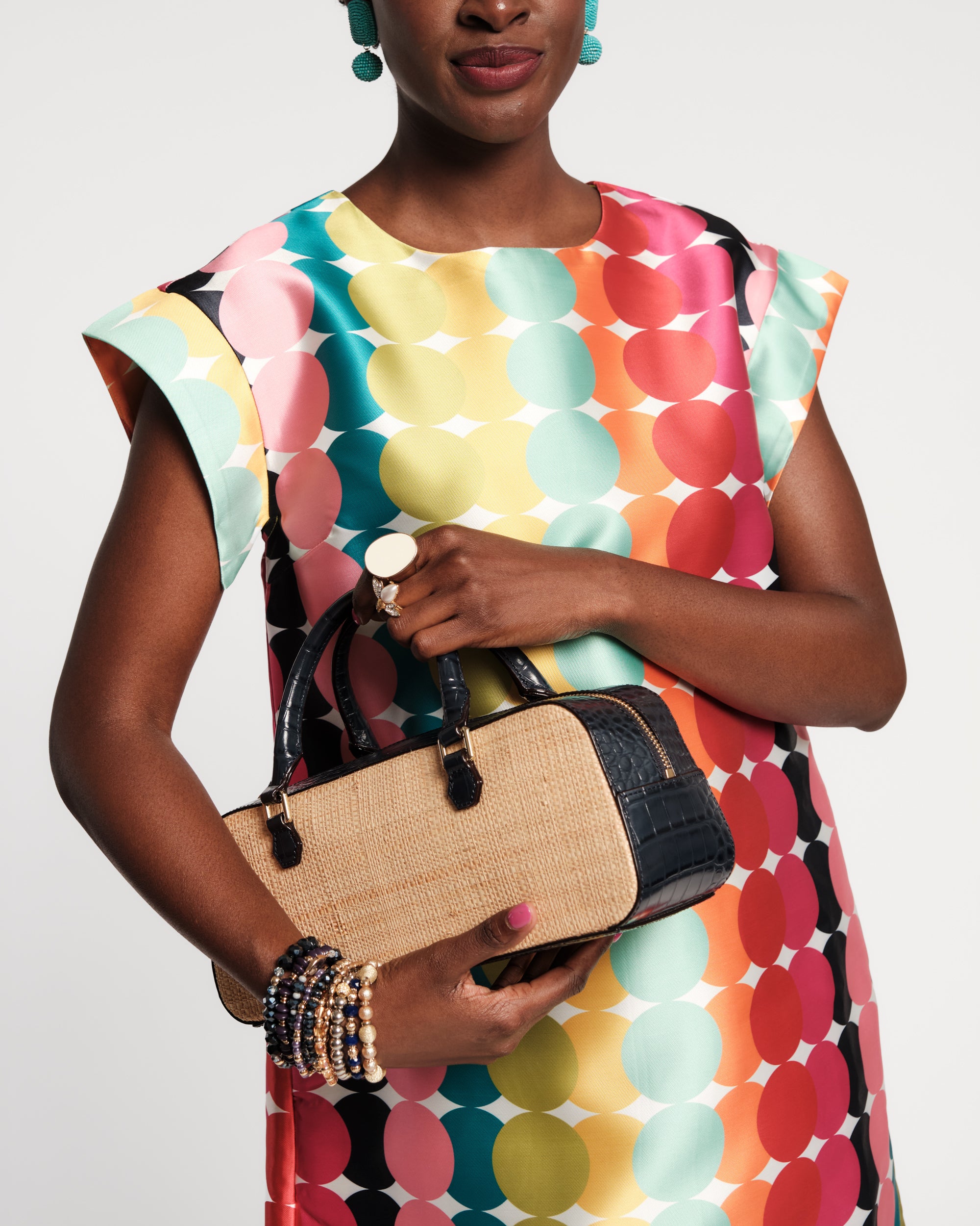 The Column Mini Dress means business from the print up. A bold rainbow circle print runs in graphic columns on a clean shift silhouette with sculptural cap sleeves that give it just the right amount of shape. It’s a dress that speaks in color and shape, turning a simple silhouette into pure, playful drama.