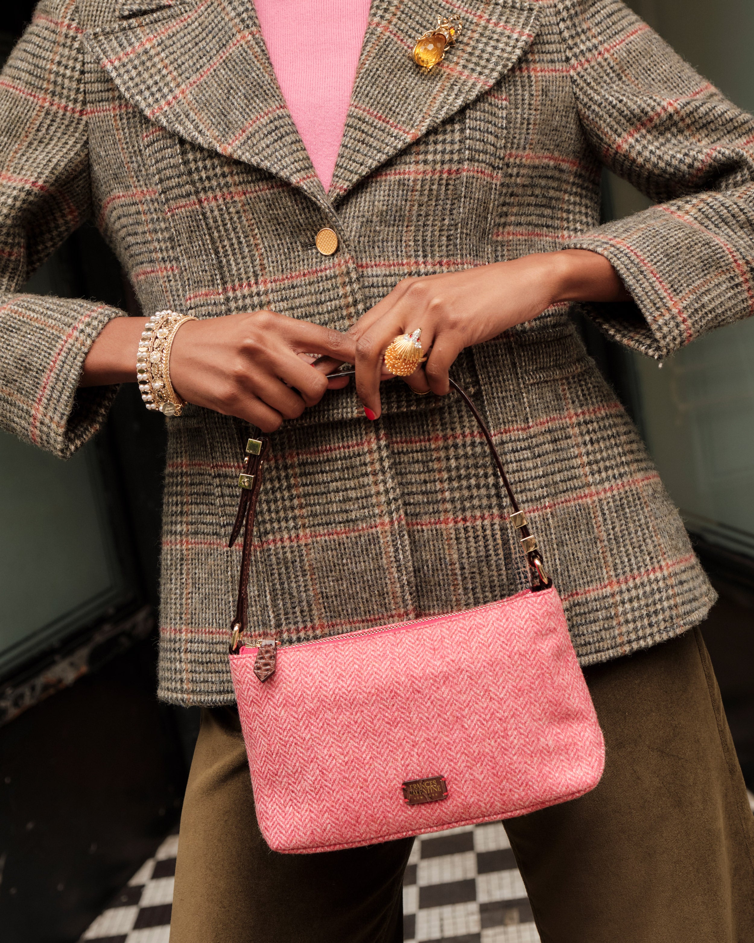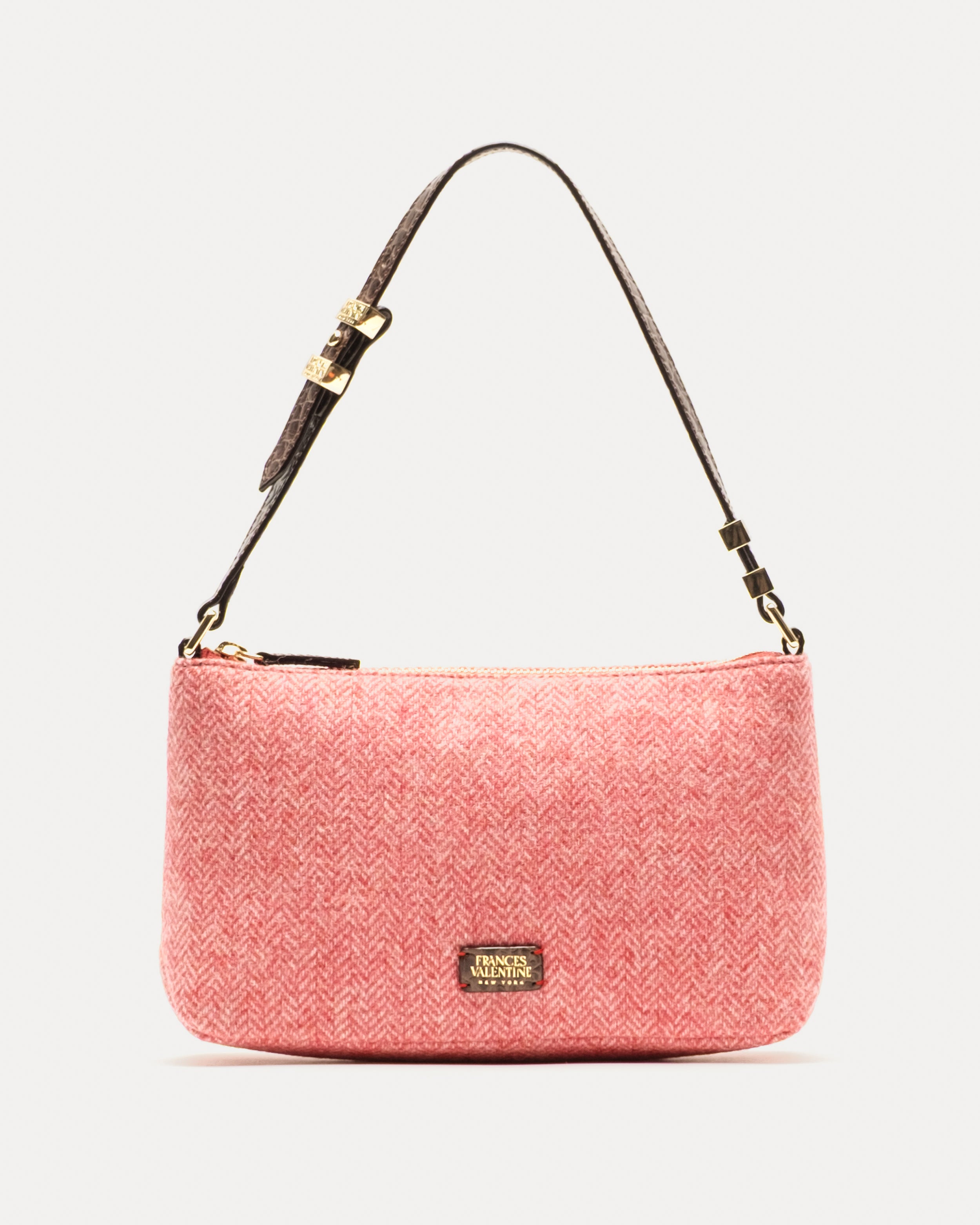 A soft pouch shoulder bag crafted in textured pink herringbone wool for a fresh twist on a classic shape. Relaxed but refined, its slouchy silhouette is designed to carry your daily must-haves with ease while adding a playful pop of texture to any look.