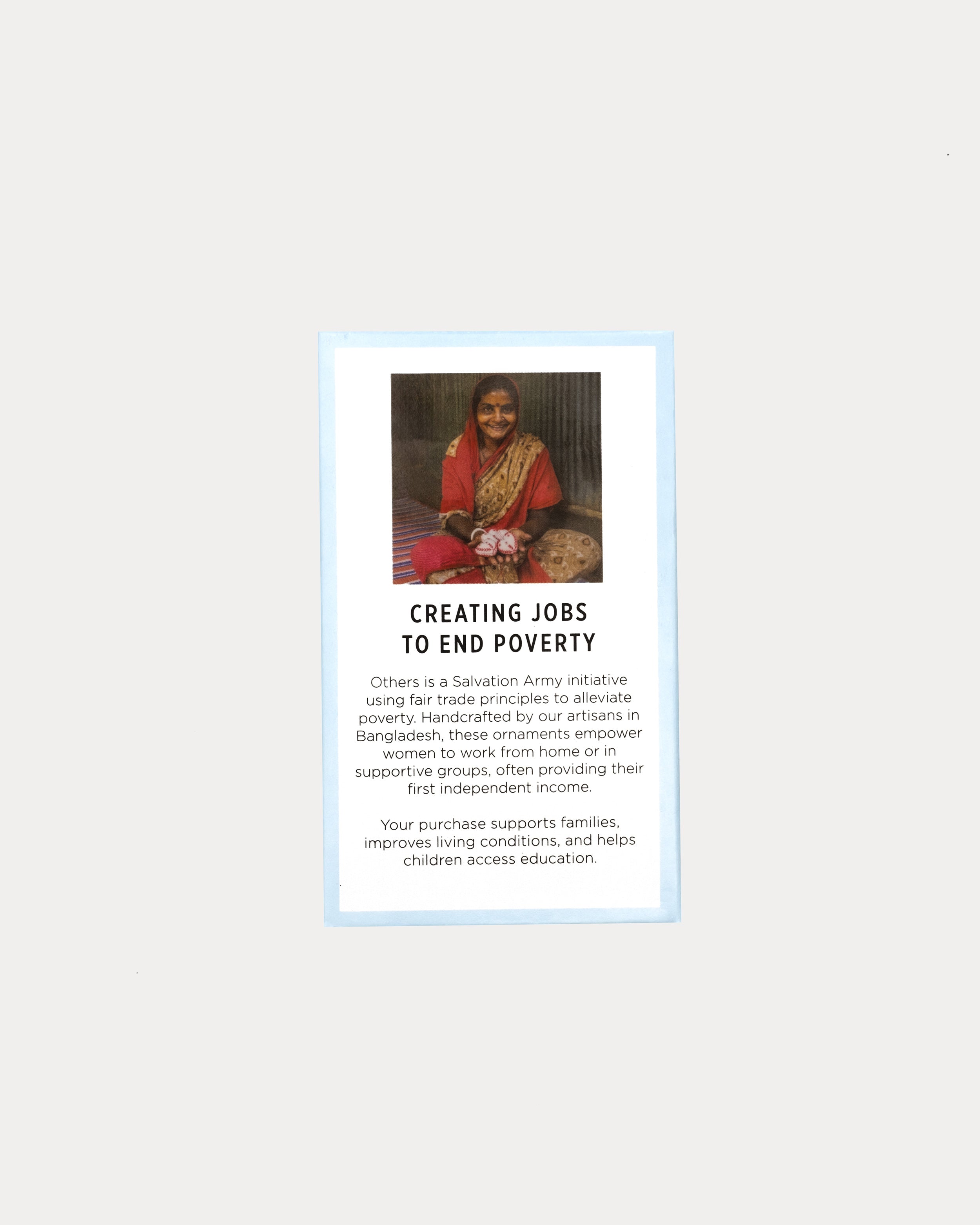 The strength of this product is that can be made everywhere without the need for expensive tools. The women can work from home at their convenience, or in the fellowship of a producer group at a local Salvation Army center. For some of our producers this is their first opportunity to earn an independent income. Working for Others supports them in providing for their families, improving their living conditions, and putting their children through school.