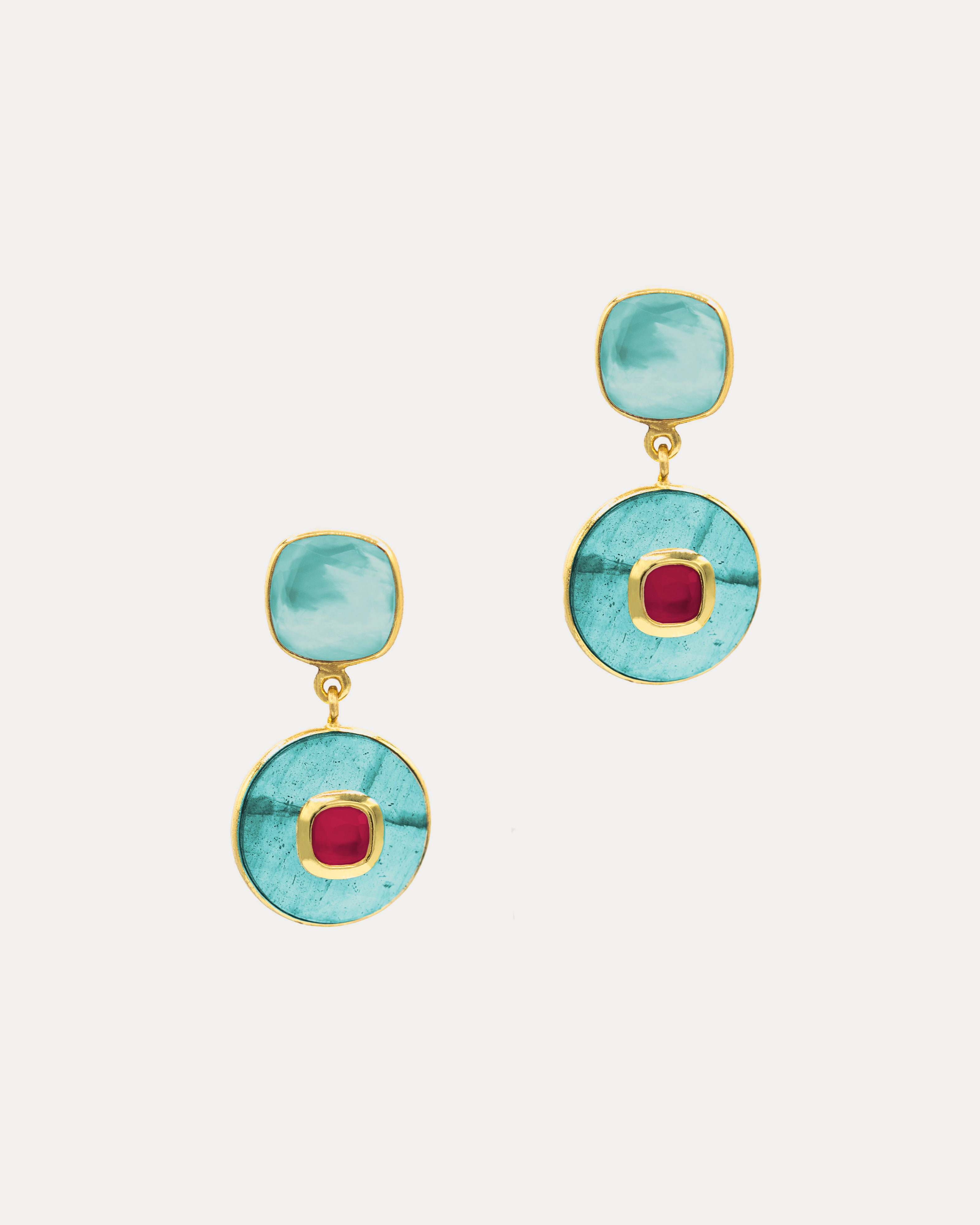 18k gold plated brush earrings with sapphire and fuschia stone in the center. Handmade in Brazil.