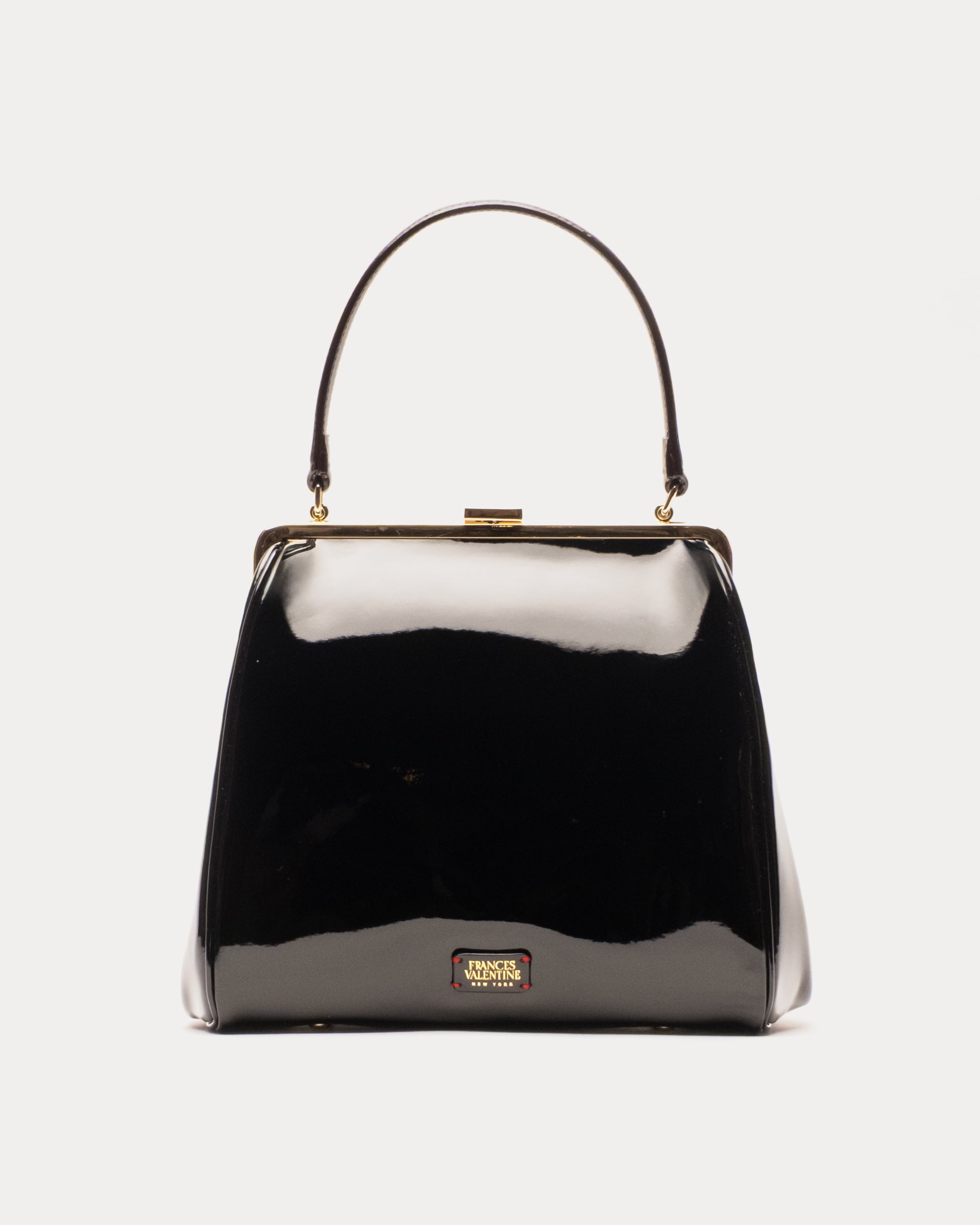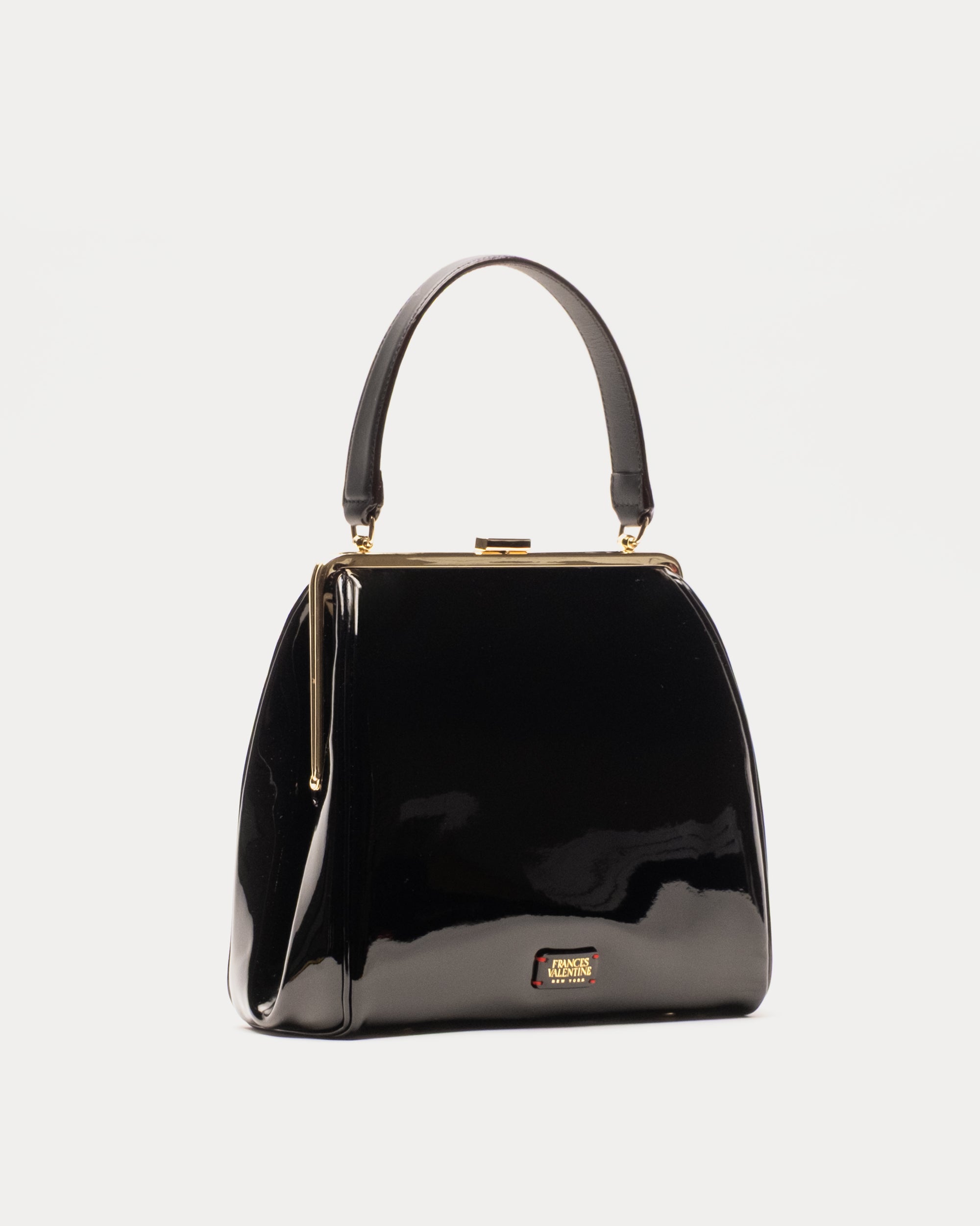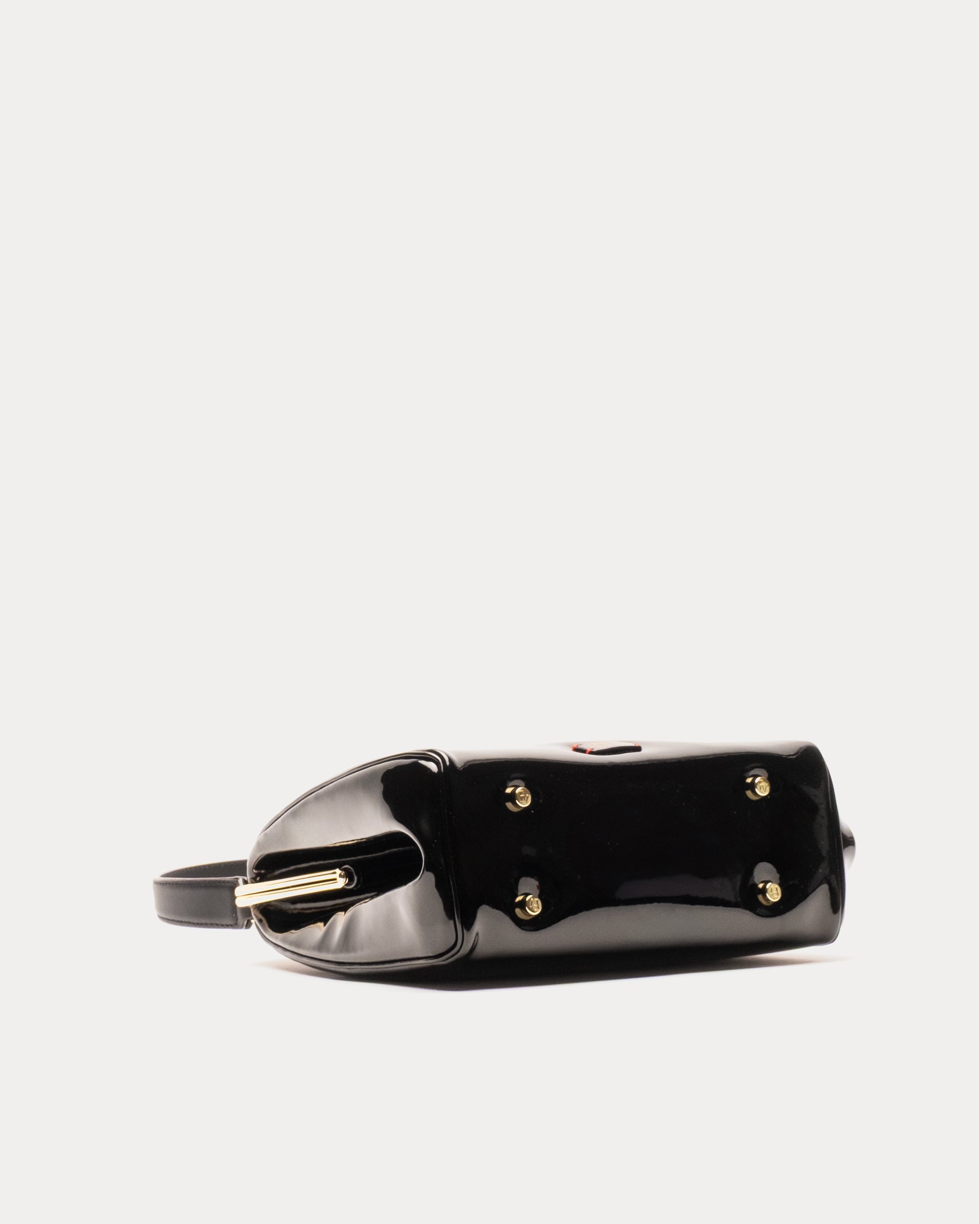 Vintage charm, modern edge. Inspired by timeless silhouettes, the handheld Katherine Frame Bag brings a sculptural twist to the classic evening bag. Crafted in a sleek patent leather and finished with a delicate kiss-lock clasp, this piece is elegance distilled, refined, feminine, and quietly bold. A slender leather strap, interior zip, slip pockets, and our signature jacquard lining complete the look. Consider it your new heirloom, made for right now.