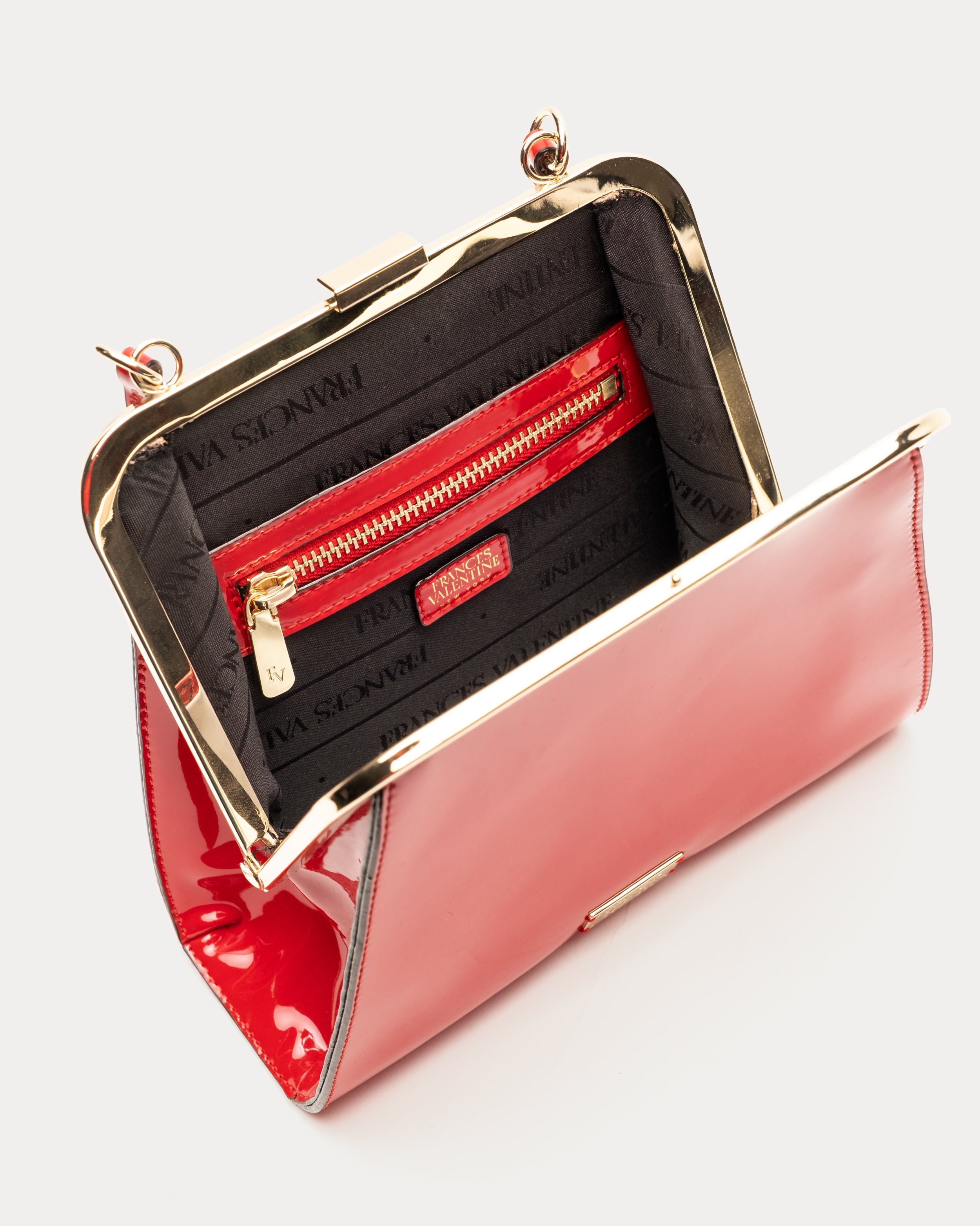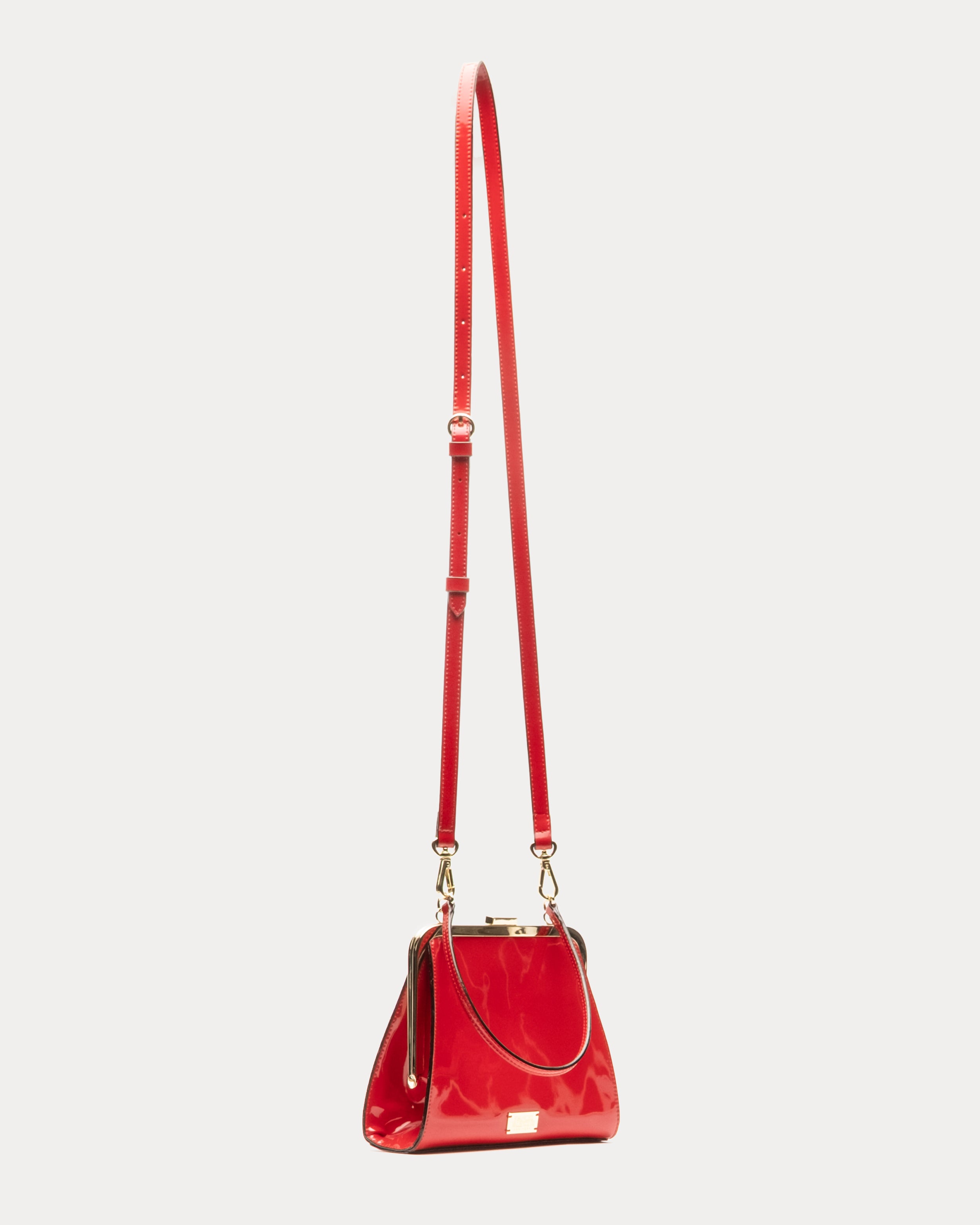 Meet the Lulu Frame Bag, tiny, glossy, and utterly irresistible. This patent leather mini, with its playful gumball-drop shape and delicate loop handle, is as sweet as candy. A classic frame silhouette with a kick-lock clasp keeps your essentials secure, while an additional crossbody strap adds effortless versatility. Finished with the signature Frances Valentine metal logo, it’s a chic little treat for any outfit.