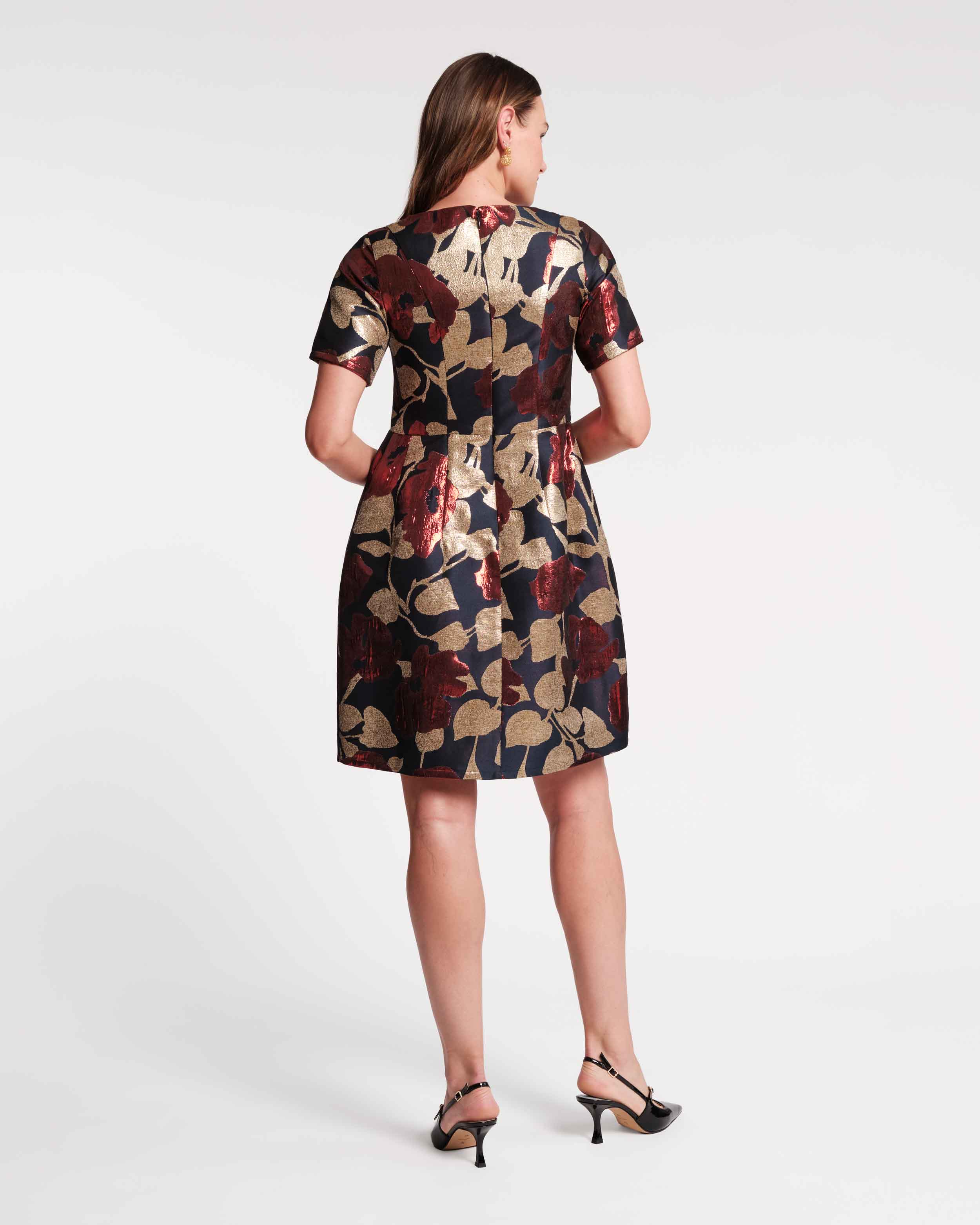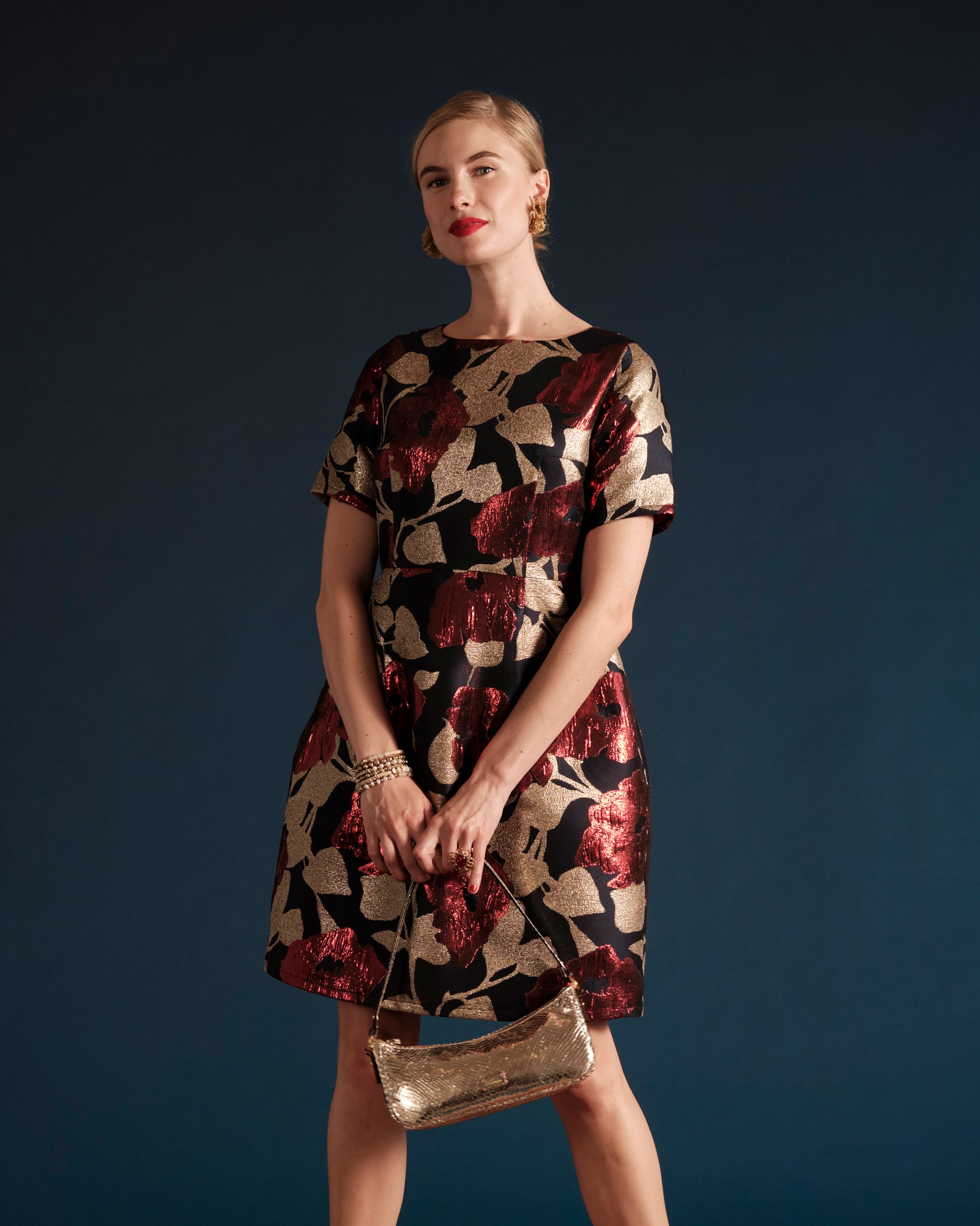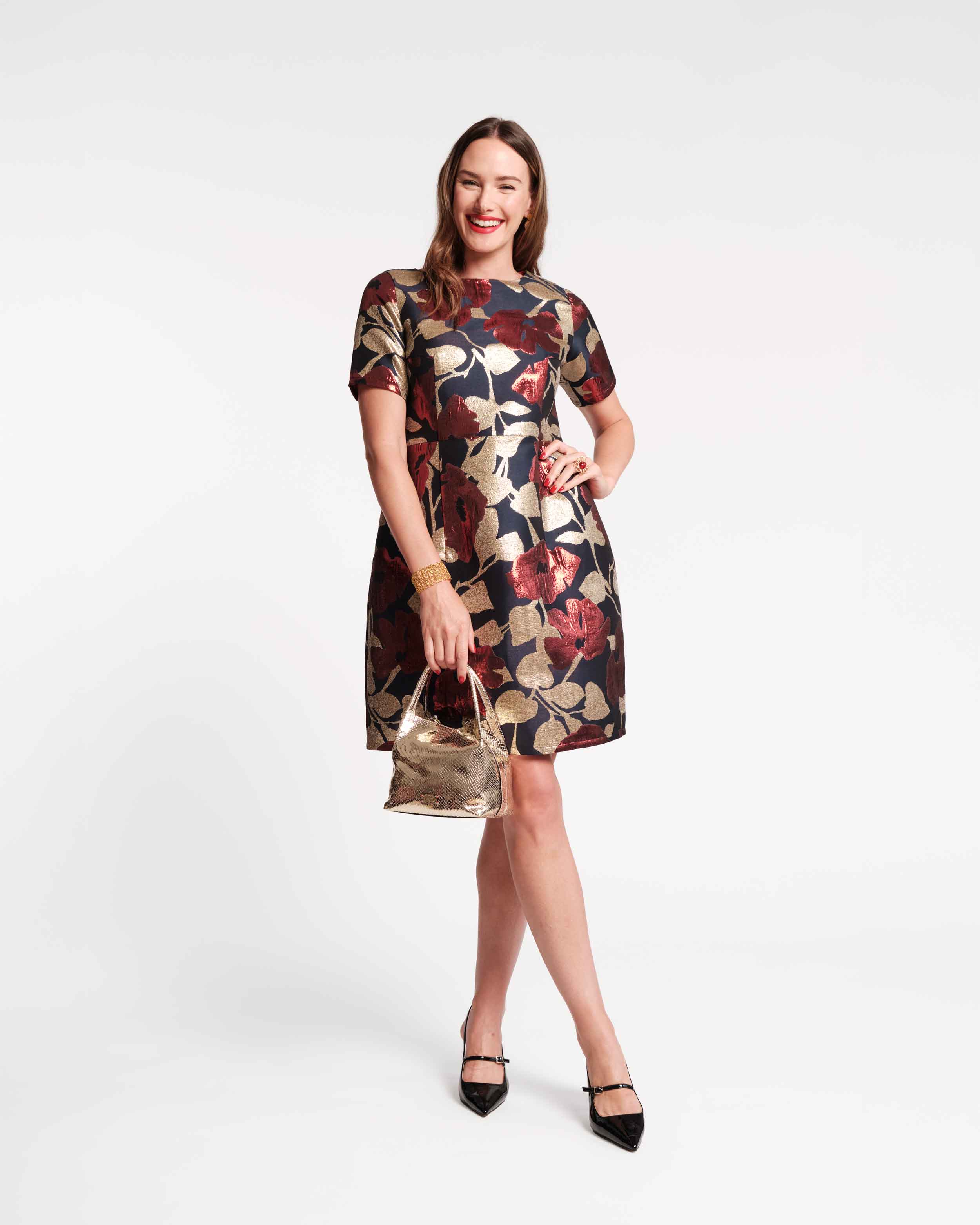 Celebrate the season in the Michelle Mini Dress, a refined yet playful holiday essential. Crafted in a luxurious floating floral jacquard, this short-sleeve mini features a fitted bodice that skims and a bell-shaped skirt, creating a sculptural silhouette. Cut to perfection, it offers comfort without compromising polish. Arriving in a striking gold and red floral, the Michelle Mini is designed for holiday soirées, festive parties, or any occasion where you want to feel effortlessly chic.