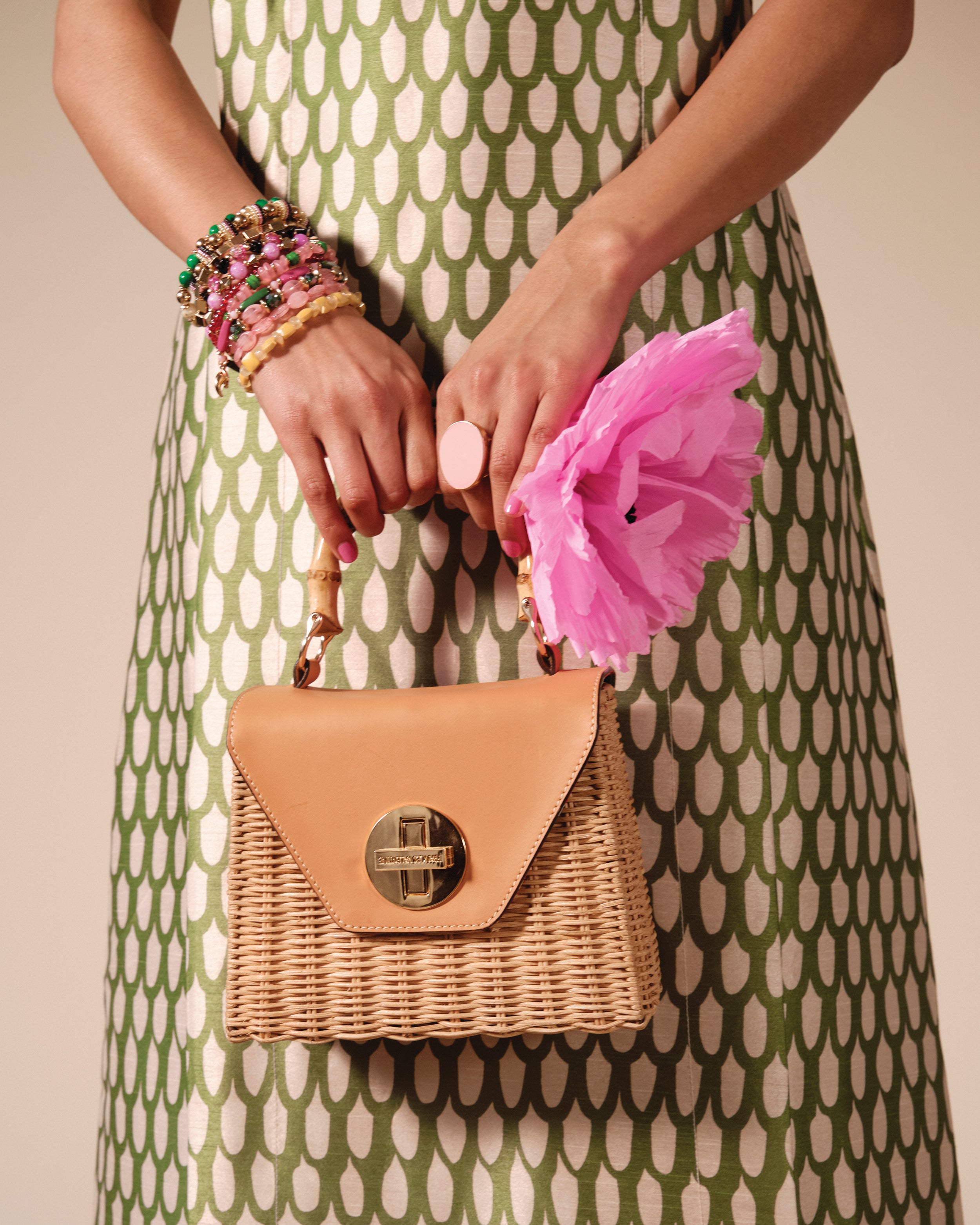 Make memories with the new Mini Midge Basket. Introducing our new playful, handwoven wicker bag with an eye-catching twist-lock closure. Its rectangular silhouette is topped with a lid that flips elegantly like an envelope, while a bamboo handle adds a touch of natural charm. Compact yet striking, this little wicker bag is the perfect warm-weather accessory for carrying just the essentials.