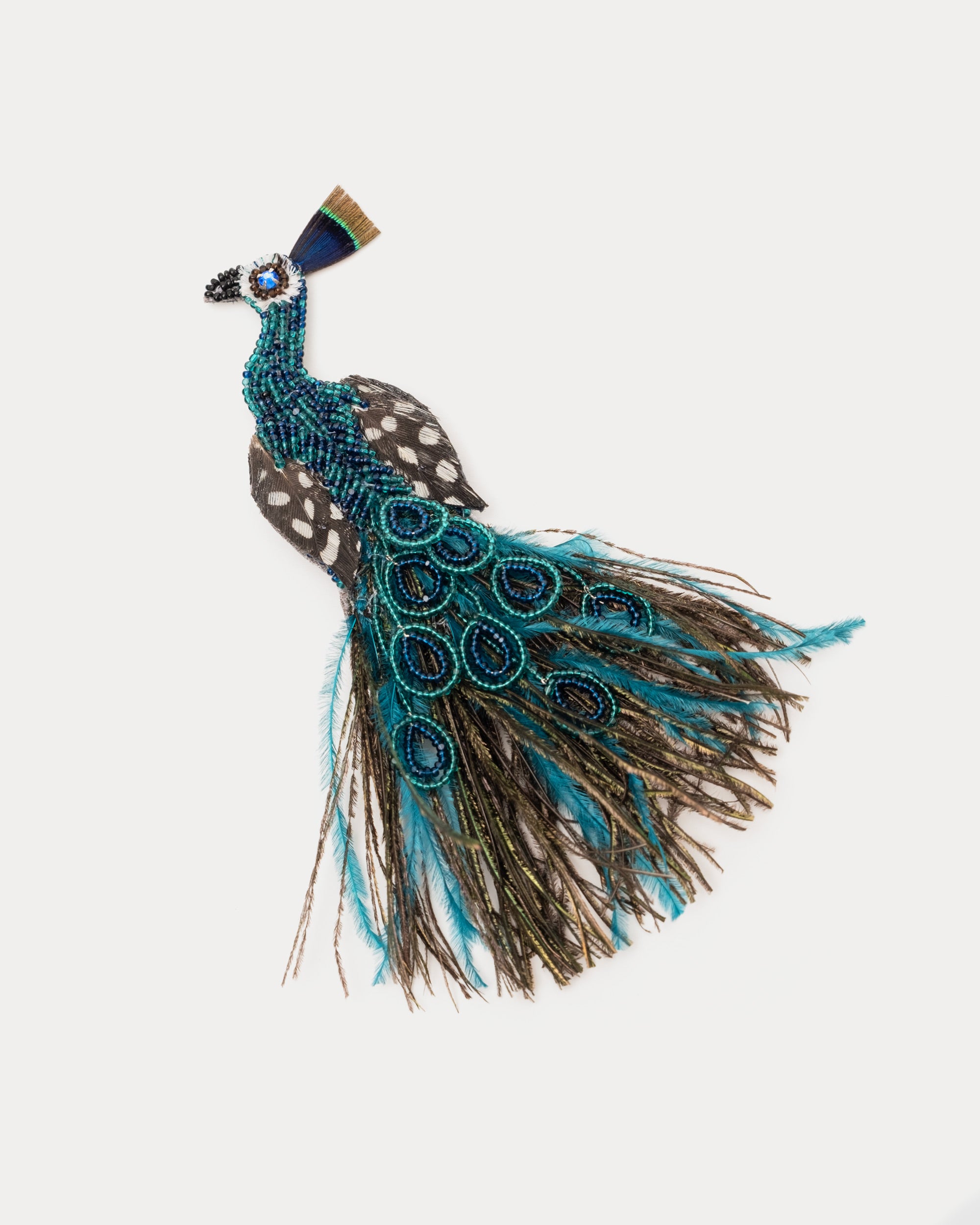 A dazzling display of elegance and flair. Hand-embroidered with intricate detail, this stunning piece captures the majestic beauty of the peacock in every feather. A true statement of sophistication, it’s the perfect way to add a touch of regal charm to any look.