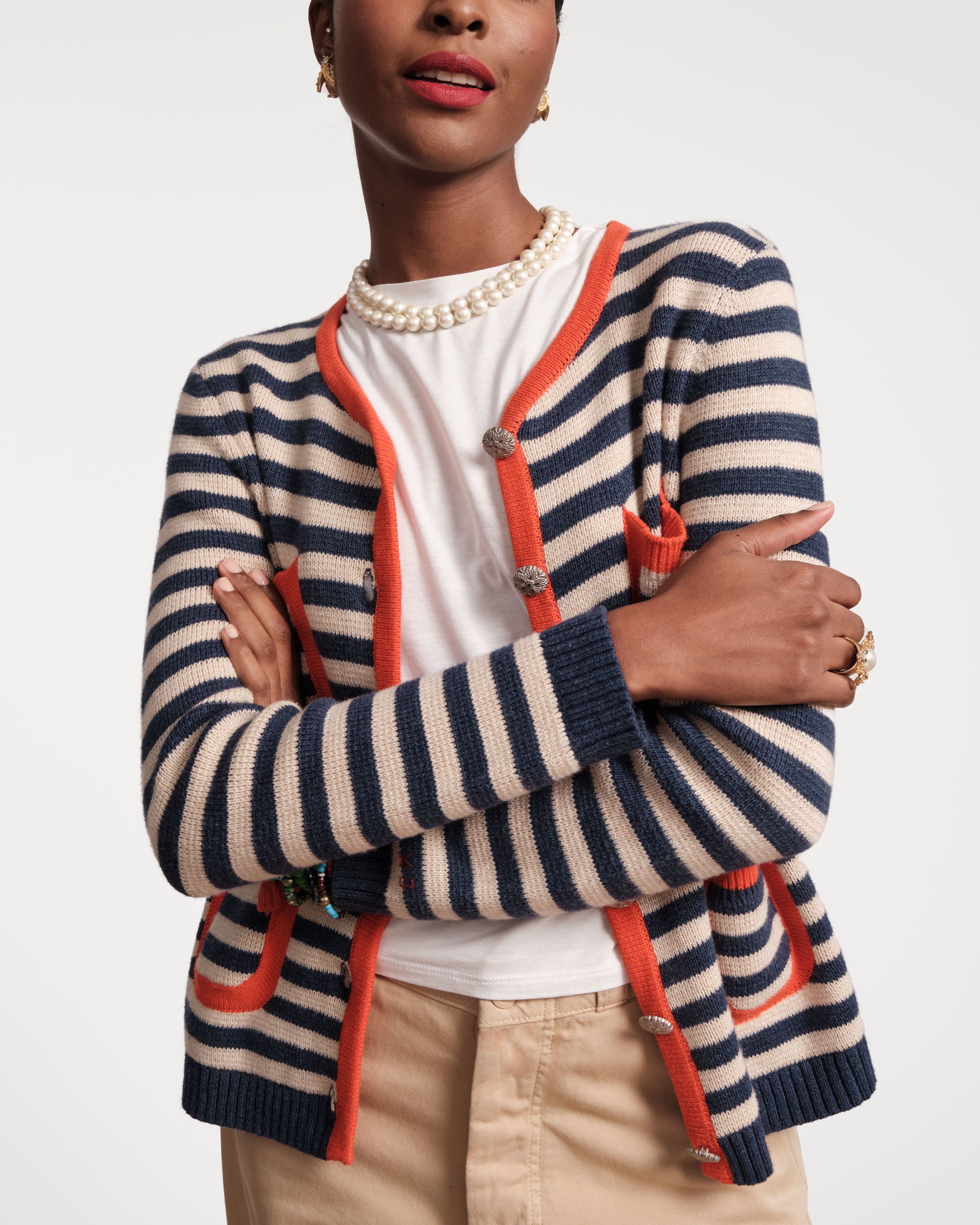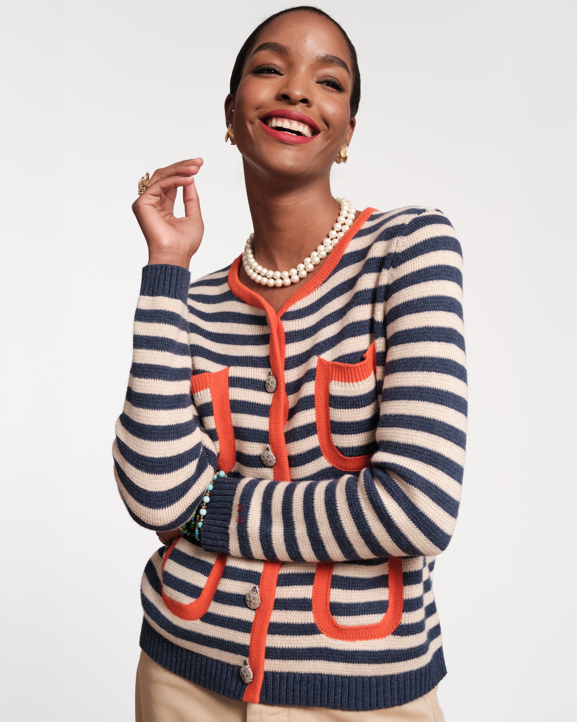 Color us happy with the spring Pierre Striped Cardigan! The cozy cardi silhouette is an instant mood-booster. With its eye-catching colorway and cozy merino wool-cashmere blend, this wardrobe essential is guaranteed to brighten your day.