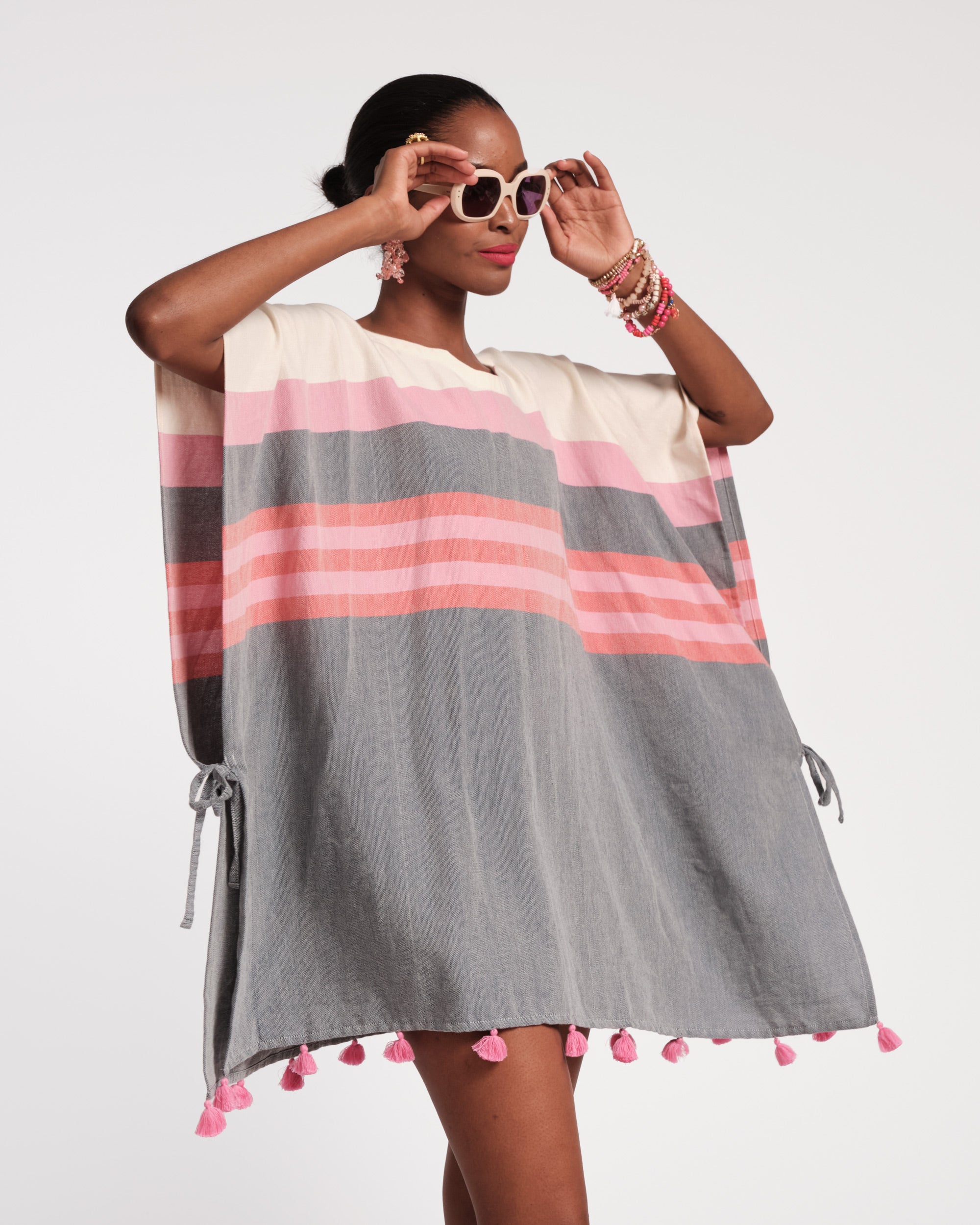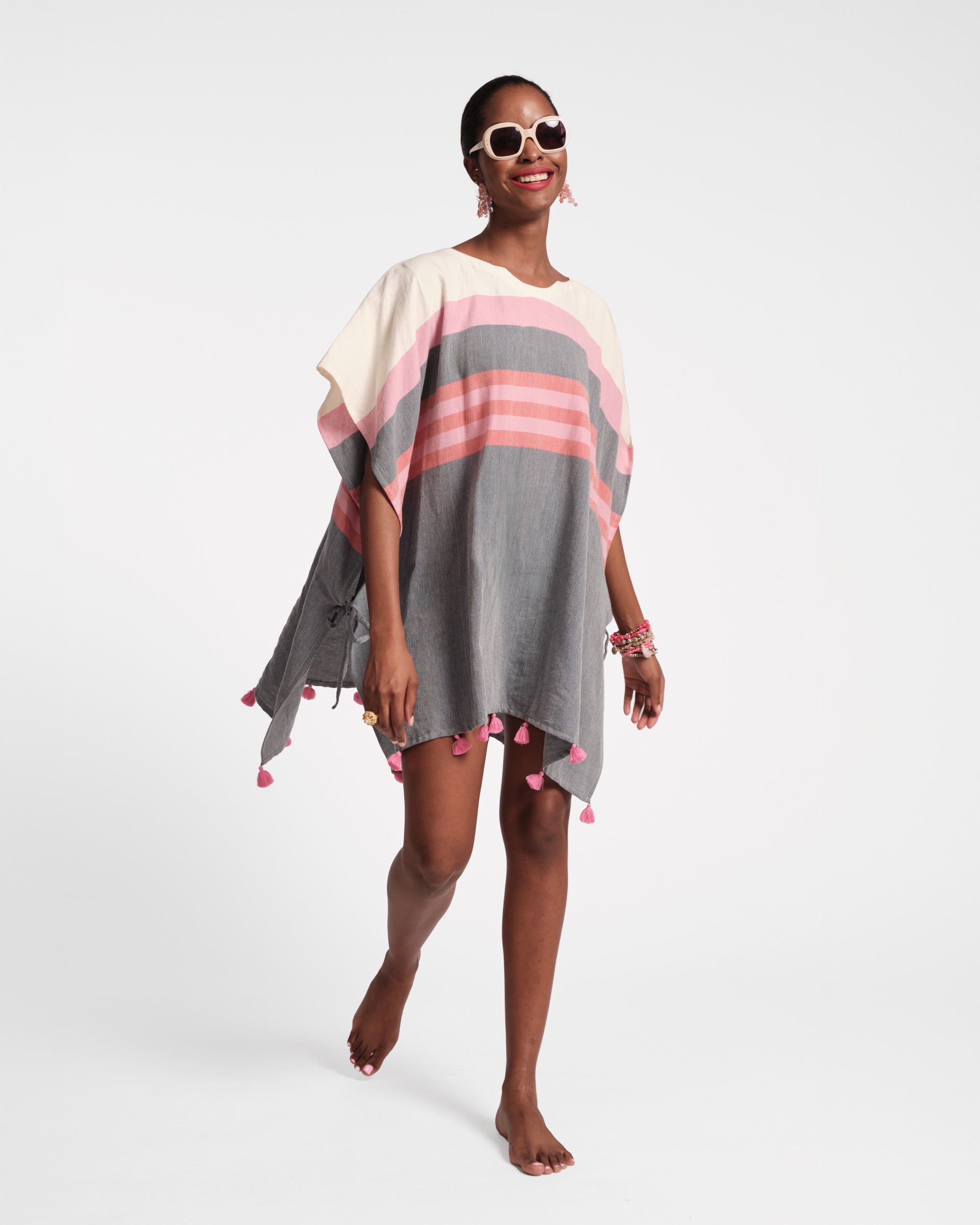 An easy throw-on layer, perfect for warm-weather days. Sumptuously soft and breathable, this airy poncho features delicate tassels and adjustable ties on the side, for a playful edge. A relaxed silhouette designed with an open collar and traced with pink and navy stripes.