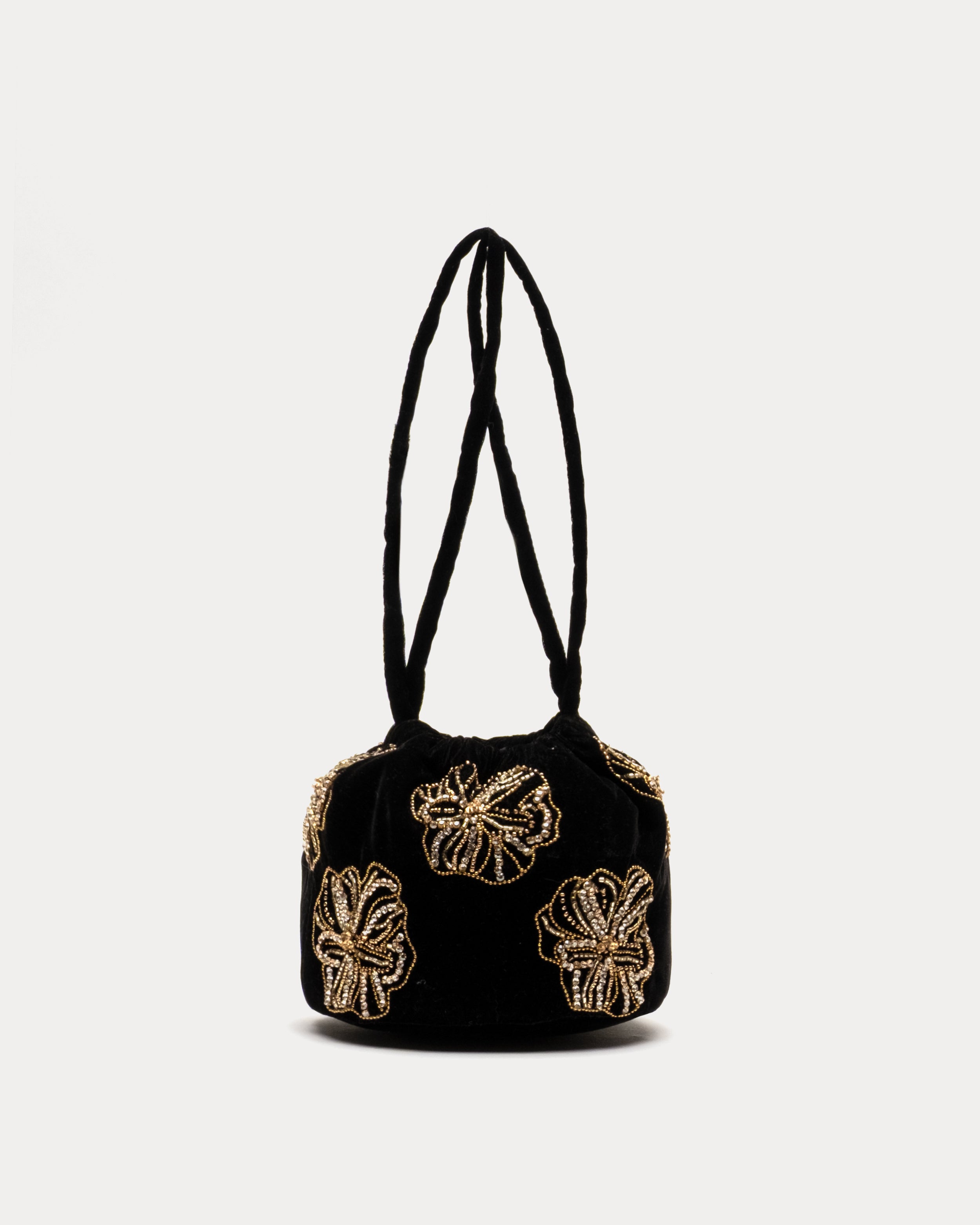 Crafted from plush velvet, this mini pouch takes on a dazzling new look with hand-beaded floral beading scattered across the surface. The softly structured shape and cinch-top closure give it an easy elegance, while the long straps make it effortless to carry. A festive twist on a favorite silhouette, perfect for evenings out or adding sparkle to the everyday.
