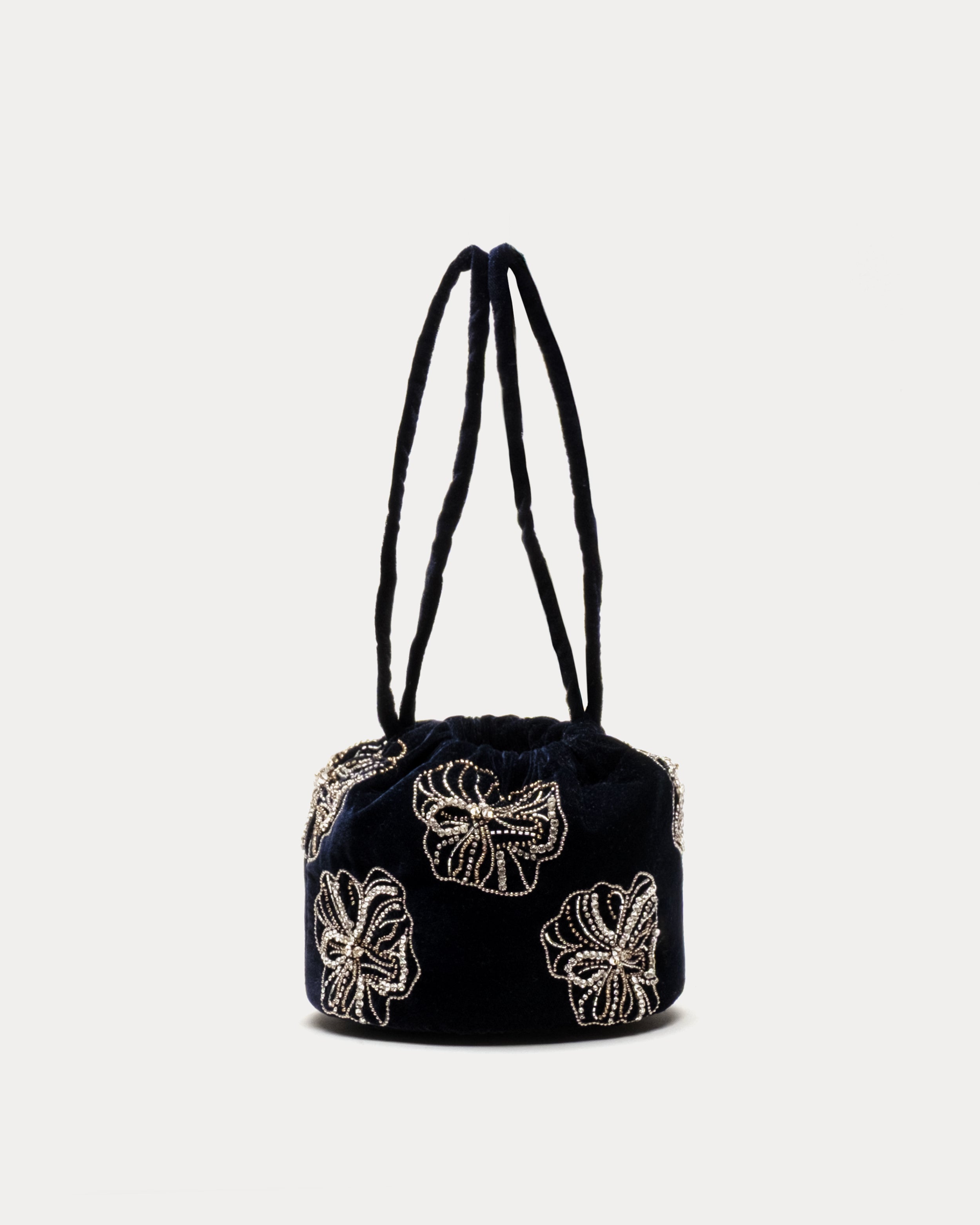 Crafted from plush velvet, this mini pouch takes on a dazzling new look with hand-beaded floral beading scattered across the surface. The softly structured shape and cinch-top closure give it an easy elegance, while the long straps make it effortless to carry. A festive twist on a favorite silhouette, perfect for evenings out or adding sparkle to the everyday.