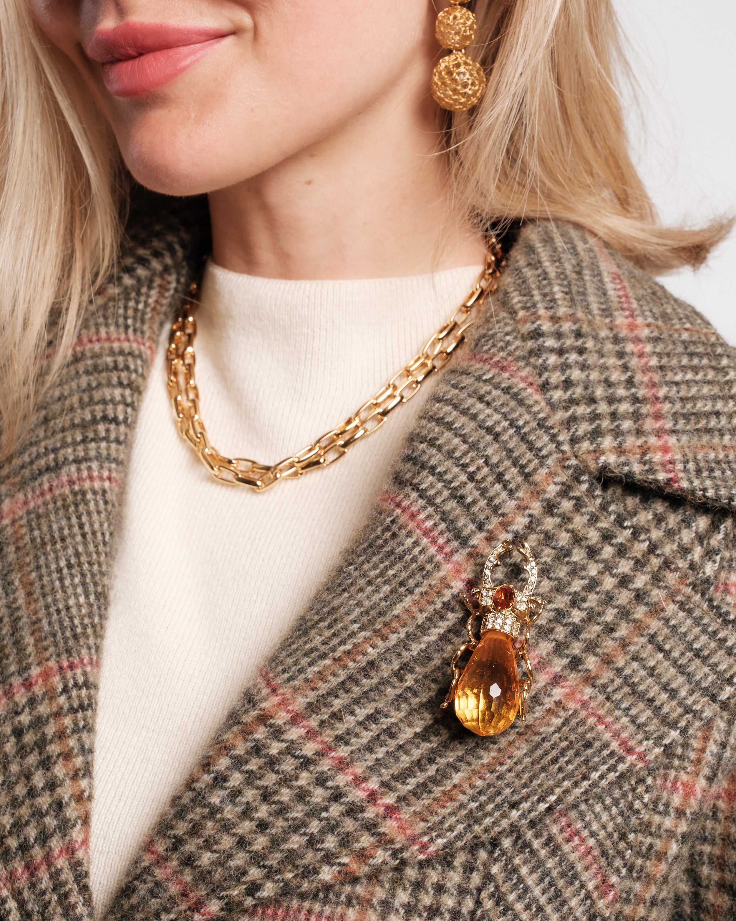 Take a walk on the wild side with our Scarab Beetle Pin, shimmering with topaz yellow crystal stones that catch the light from every angle. A striking accent with a playful edge, it elevates any lapel, scarf, or accessory with a hint of unexpected glamour.