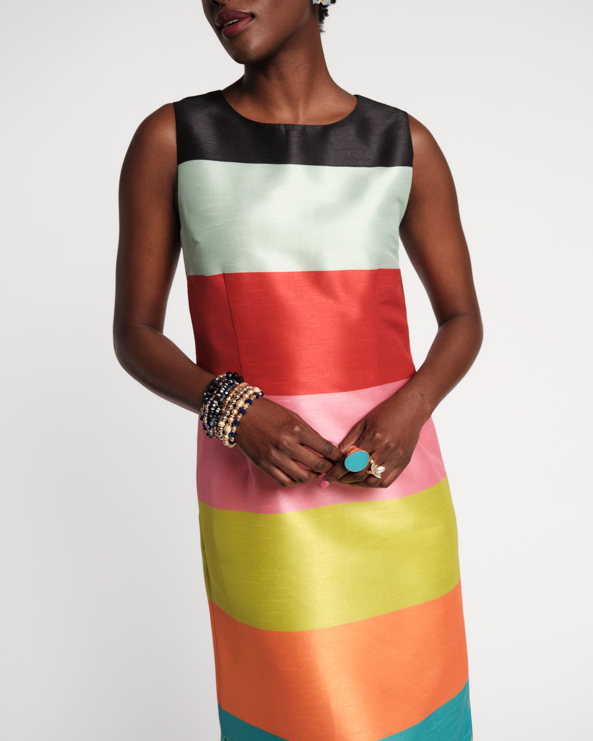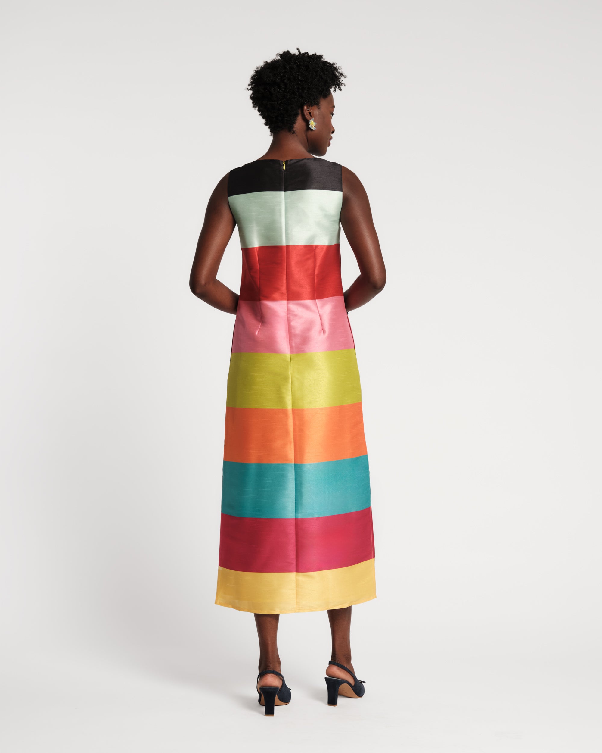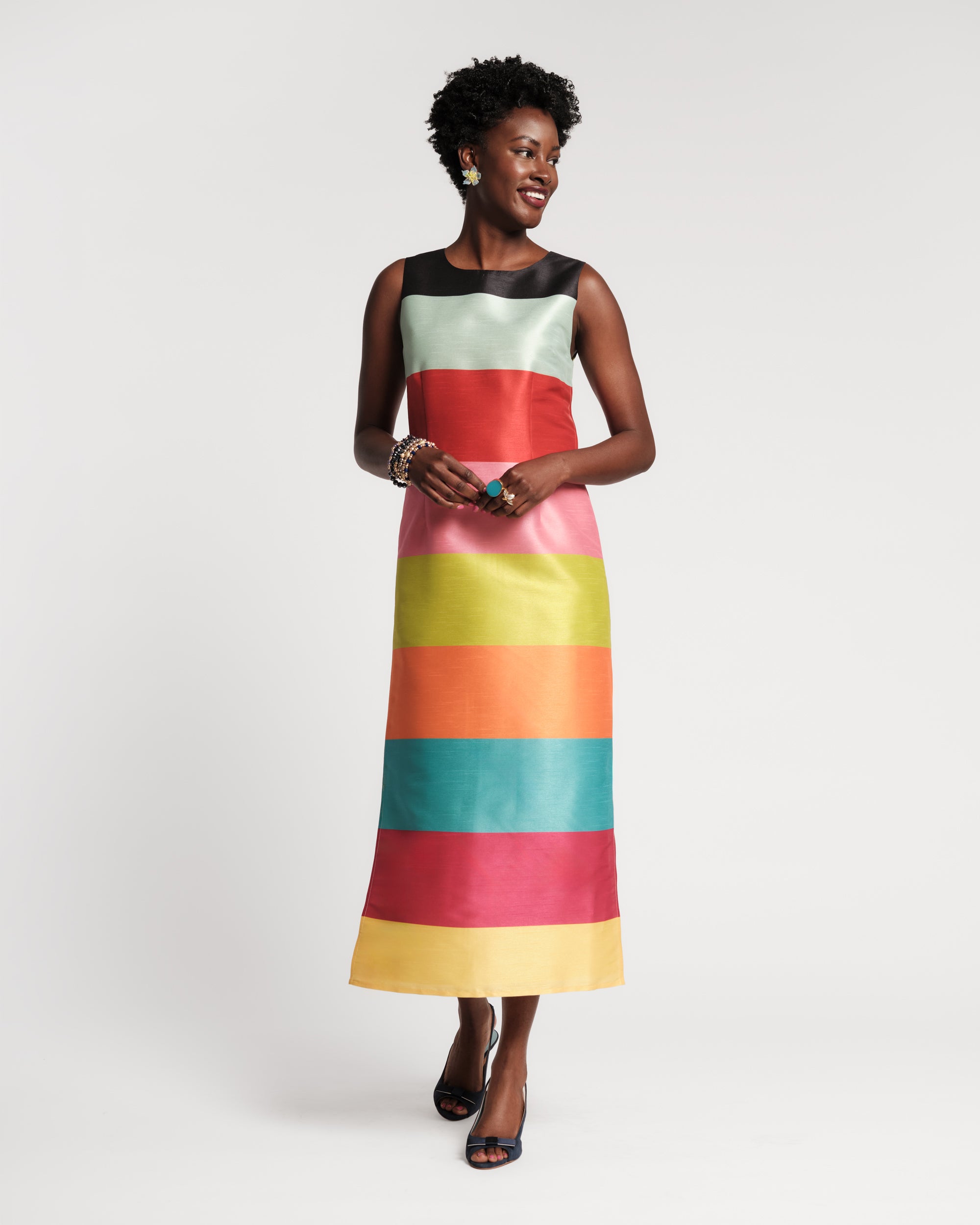 Make a statement that needs no explanation. This color-block maxi dress arrives in a parade of metallic stripes, cut into a sleek column silhouette with a fitted bodice and crew neckline.It's the kind of dress you wear when you've already decided it's going to be a great day. For the signature FV x AP styling, pair the Sleeveless Column Maxi Dress with a bold supersize clutch in embossed croc.