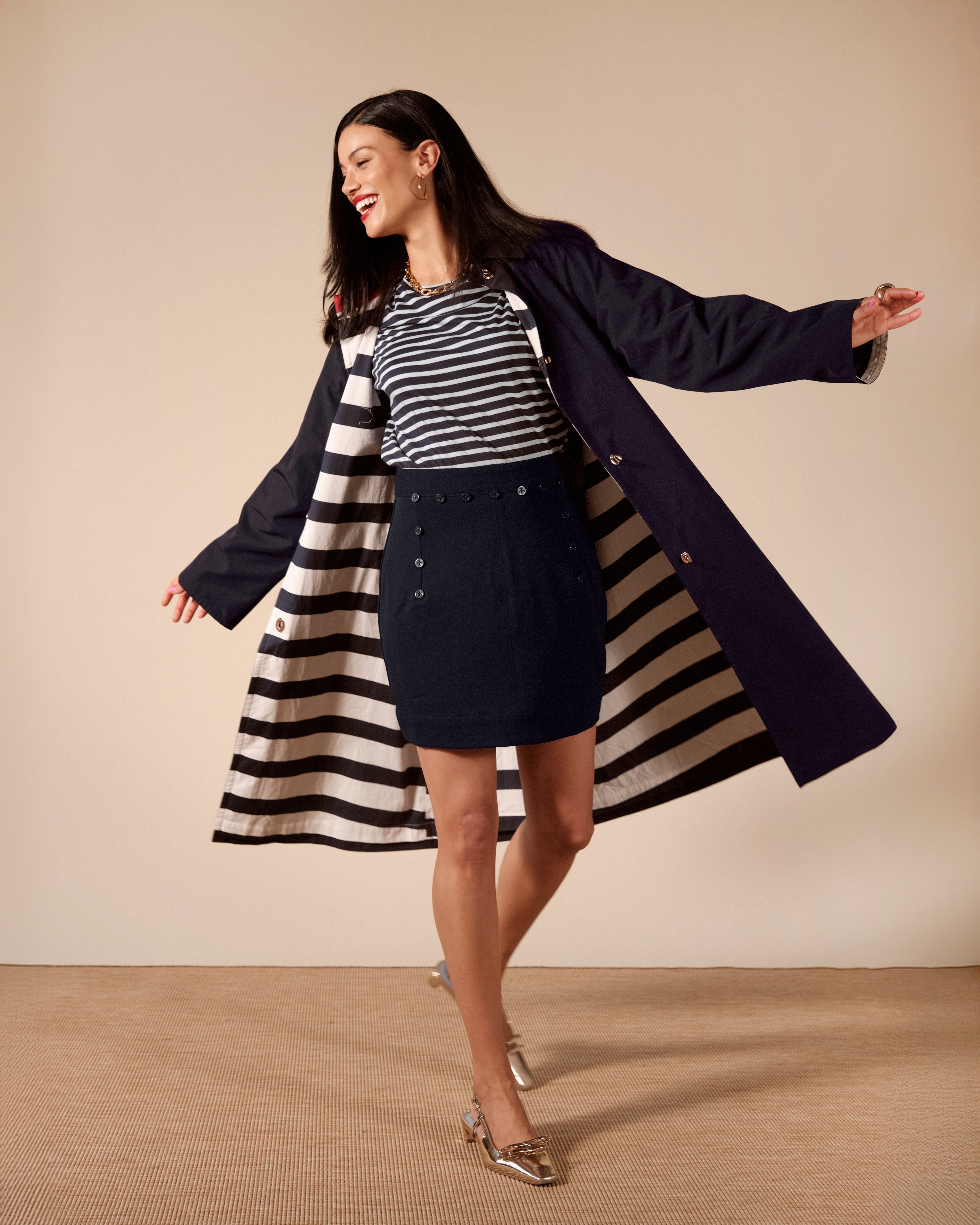 Our new classic navy trench coat features gleaming gold buttons and crisp white cuff accents. The interior is lined with navy stripes and finished with a subtle red detail at the collar, adding a refined, unexpected touch to this timeless wardrobe staple.