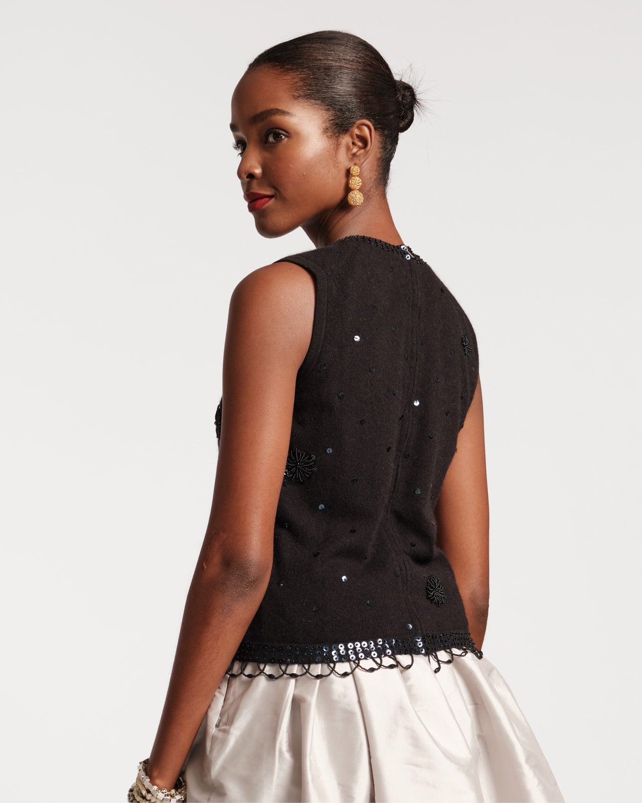 The icing on top of separates, our hand-embroidered Knit Shell Top is a women's sleeveless top with a rounded collar, decorative waistline, beaded bodice designs, and sequined hems. Worn on its own, layered over sleeves, or under a sweater – this dressy shell top is a showstopper.
