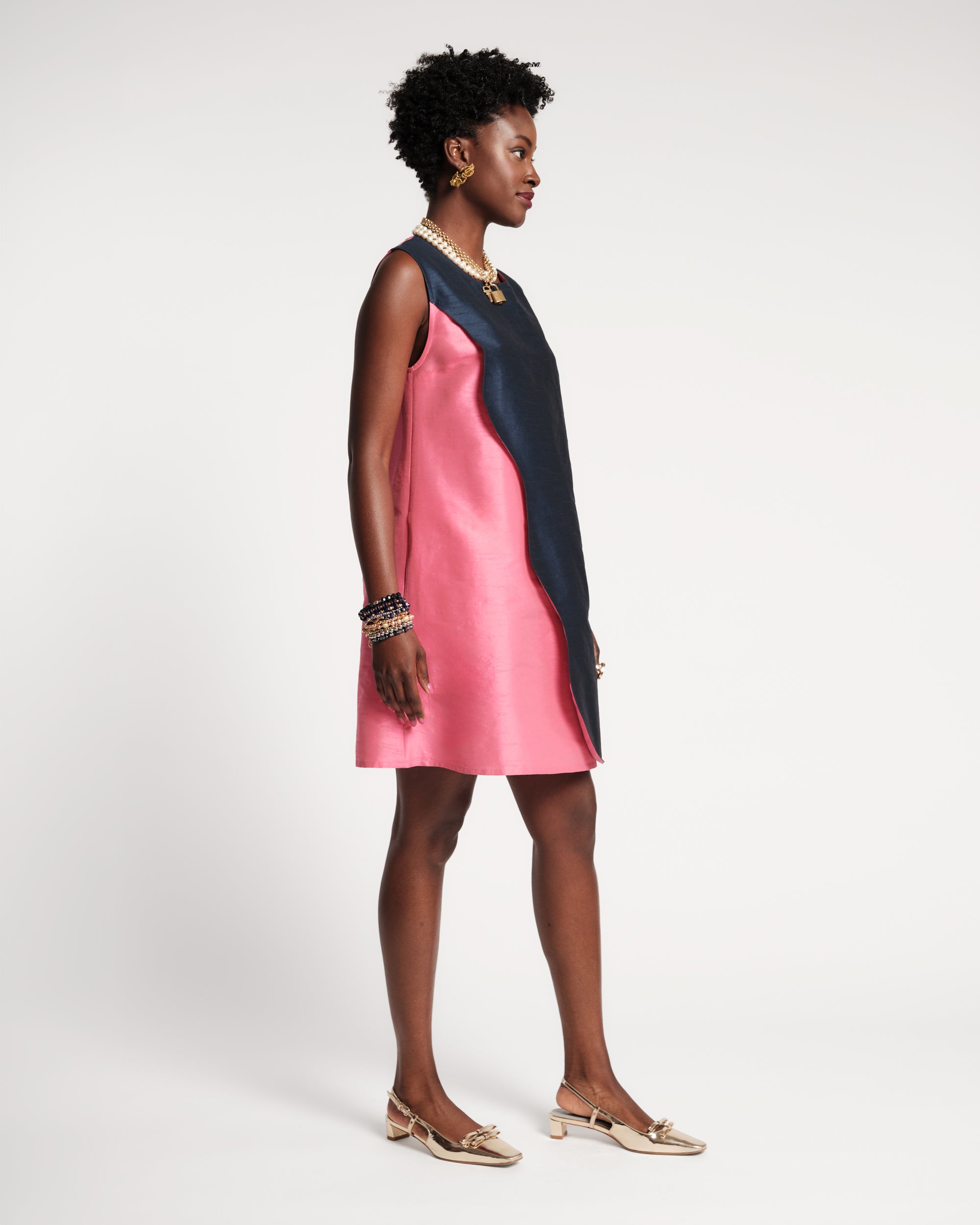 The Wave Mini Dress strikes a balance. It's color blocked from the front, with a navy wave-edged panel that sweeps across the body, moving with you. Turn around, and the story shifts, revealing a full wash of pink. One dress, two distinct impressions.